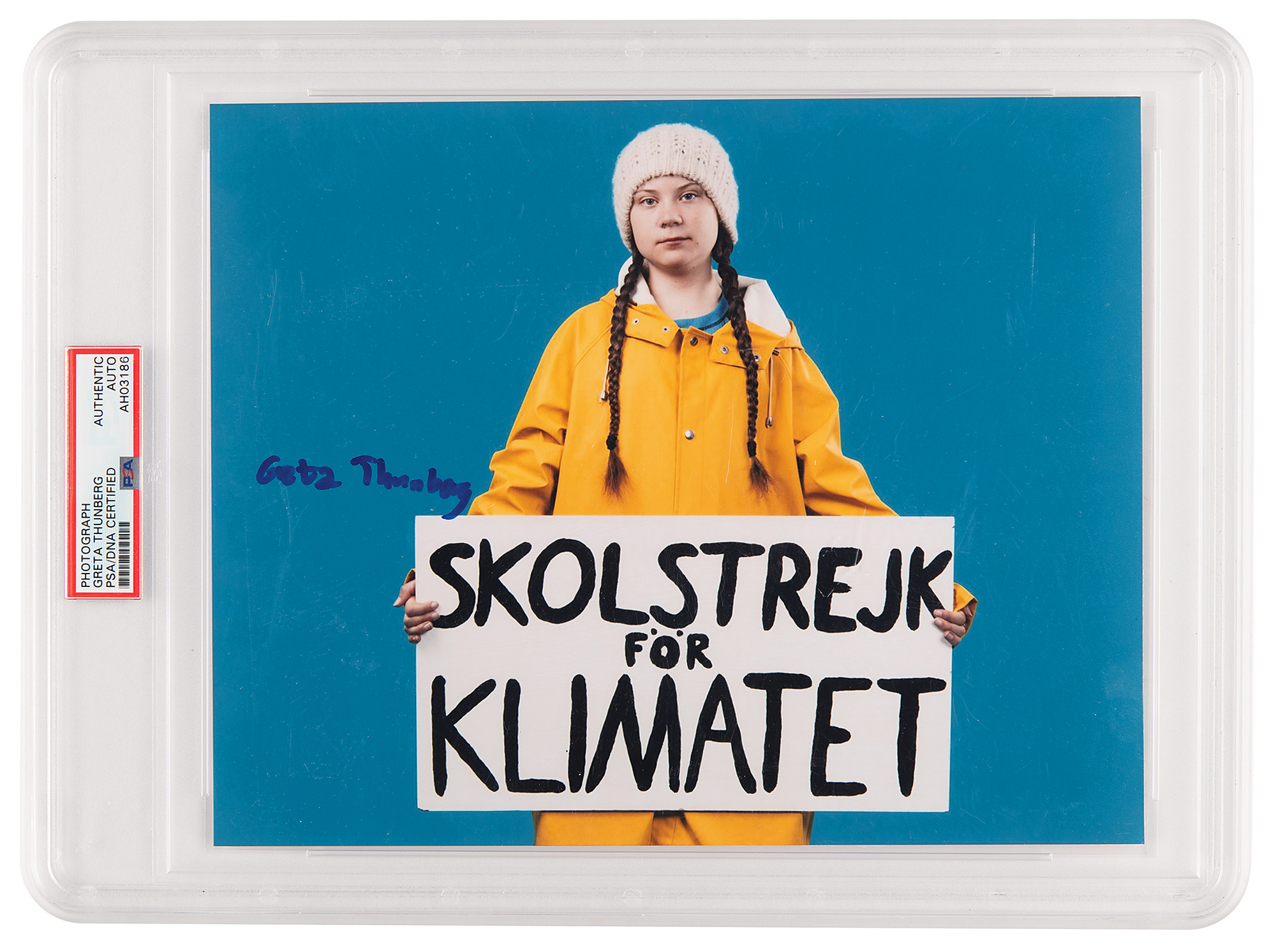 Color satin-finish 10 x 8 photo of environmental activist Greta Thunberg holding a sign that reads "Skolstrejk for Klimatet" which translates to "School Strike for the Climate," signed in blue felt tip. In fine condition. Encapsulated in a PSA/DNA authentication holder.
