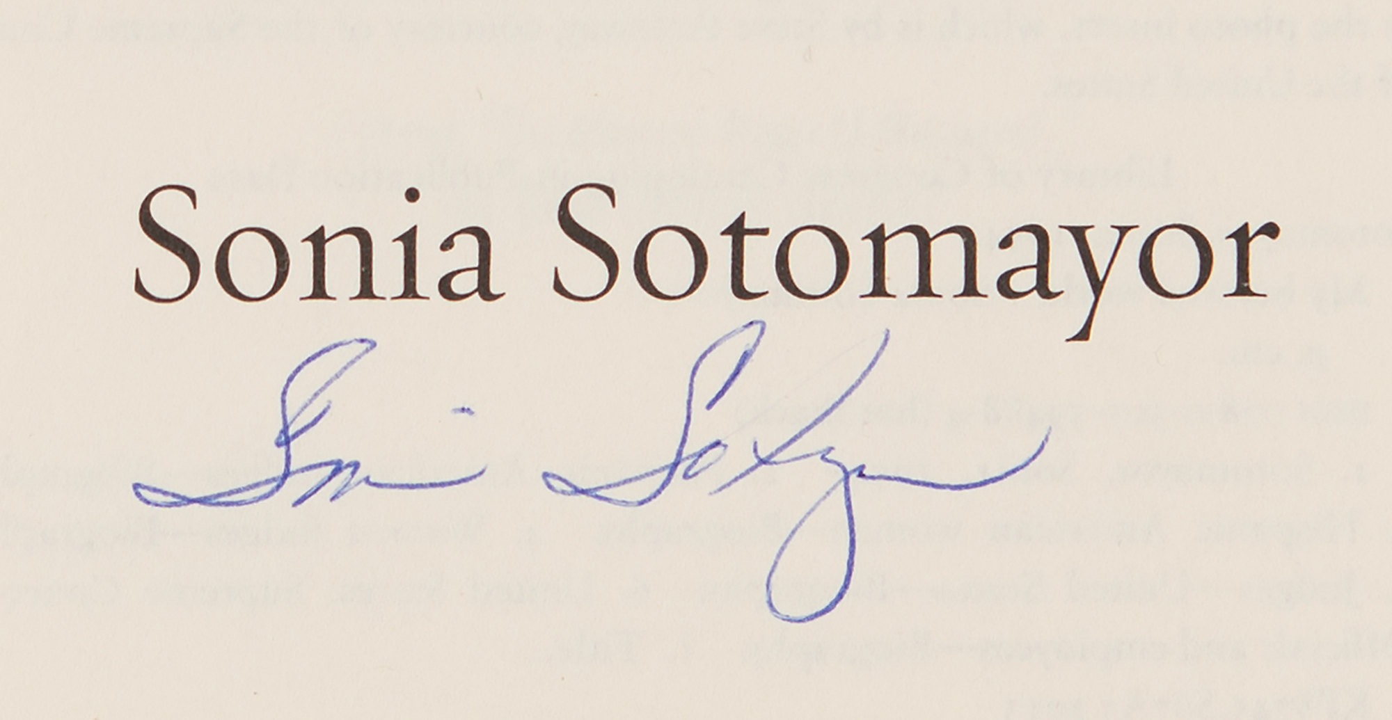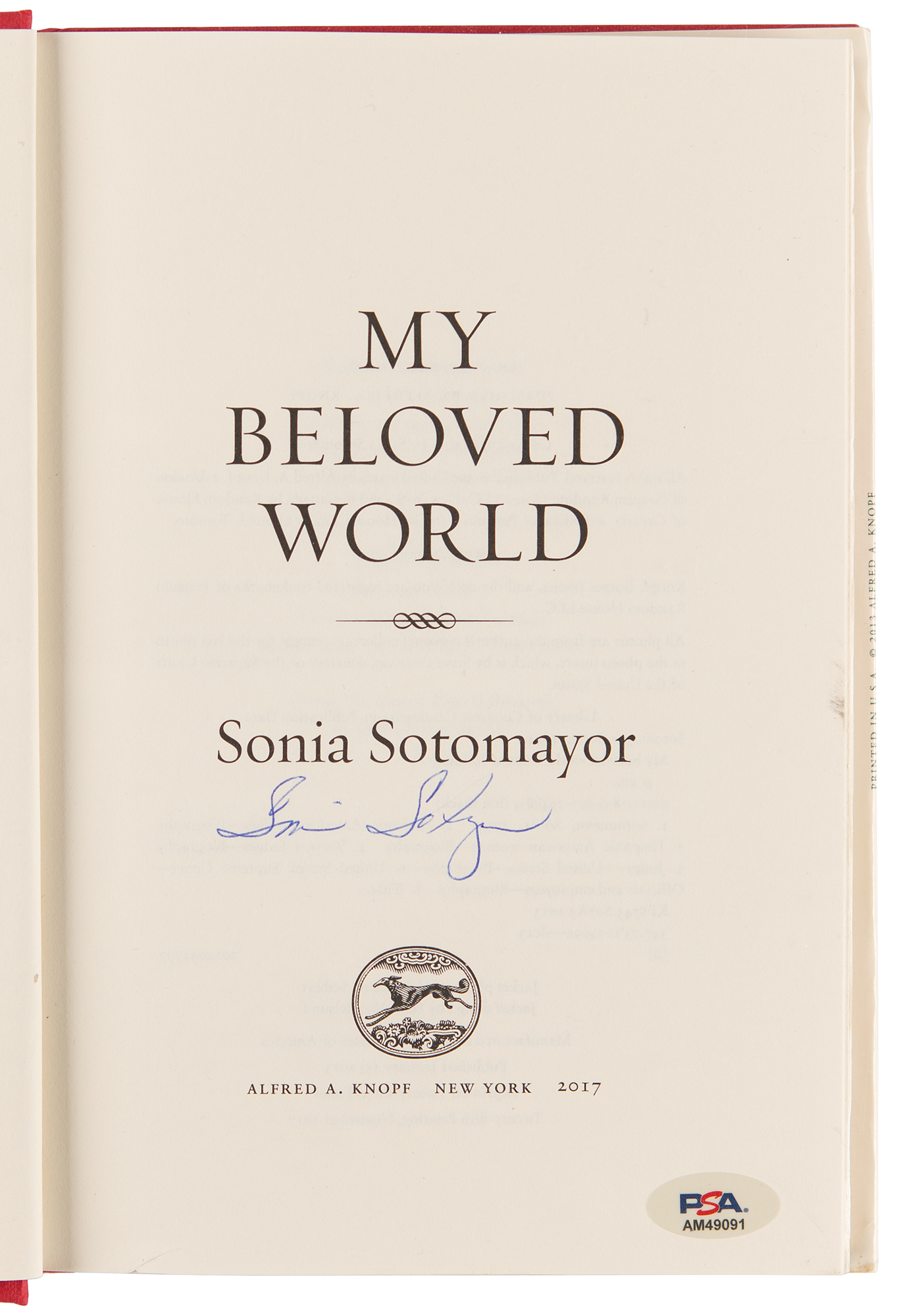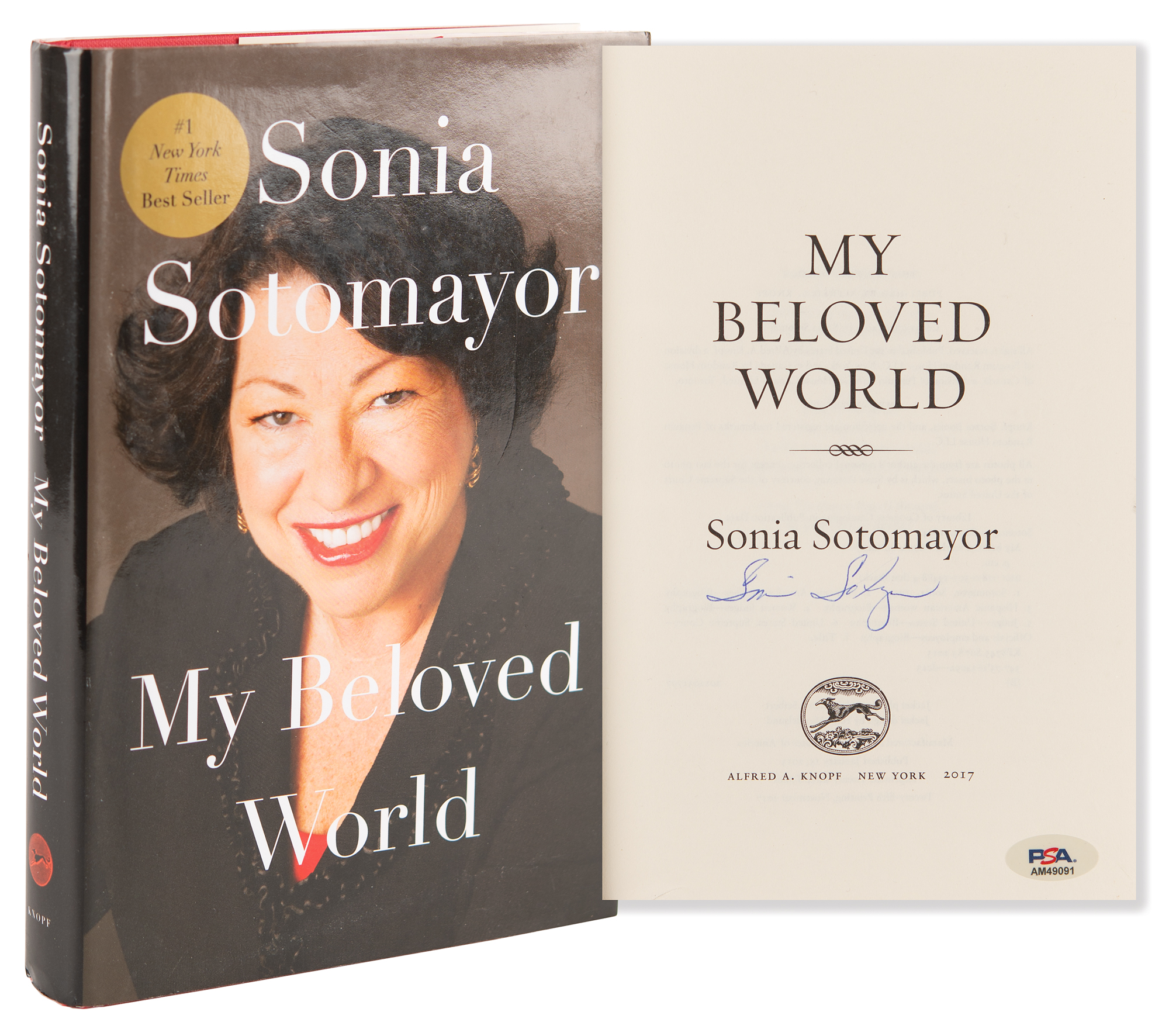 Signed book: My Beloved World. Later printing. NY: Alfred A. Knopf, 2013. Hardcover with dust jacket, 6.5 x 9.5, 315 pages. Signed on the title page in blue ballpoint by Sonia Sotomayor. In fine condition, with light wear to the dust jacket and a PSA/DNA authentication label affixed to the signed page.