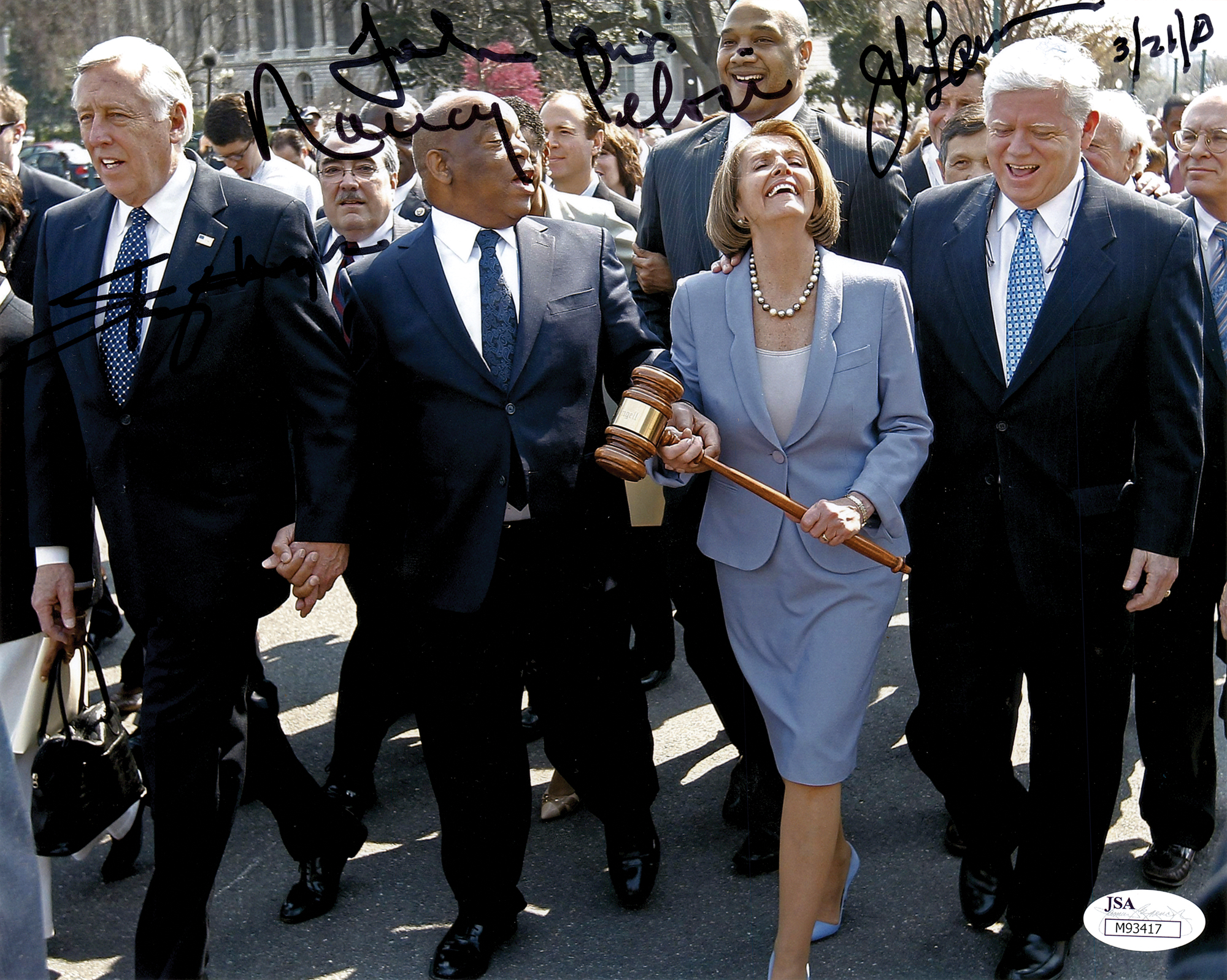 Color satin-finish 10 x 8 photo of Nancy Pelosi holding a large gavel while walking alongside Steny Hoyer, John Lewis, and John Larson, as they prepare to pass the Affordable Care Act, signed by each in black felt tip and dated March 21, 2010. In very fine condition, with a JSA authentication label affixed to the lower right corner. Accompanied by certificate of authenticity from JSA.