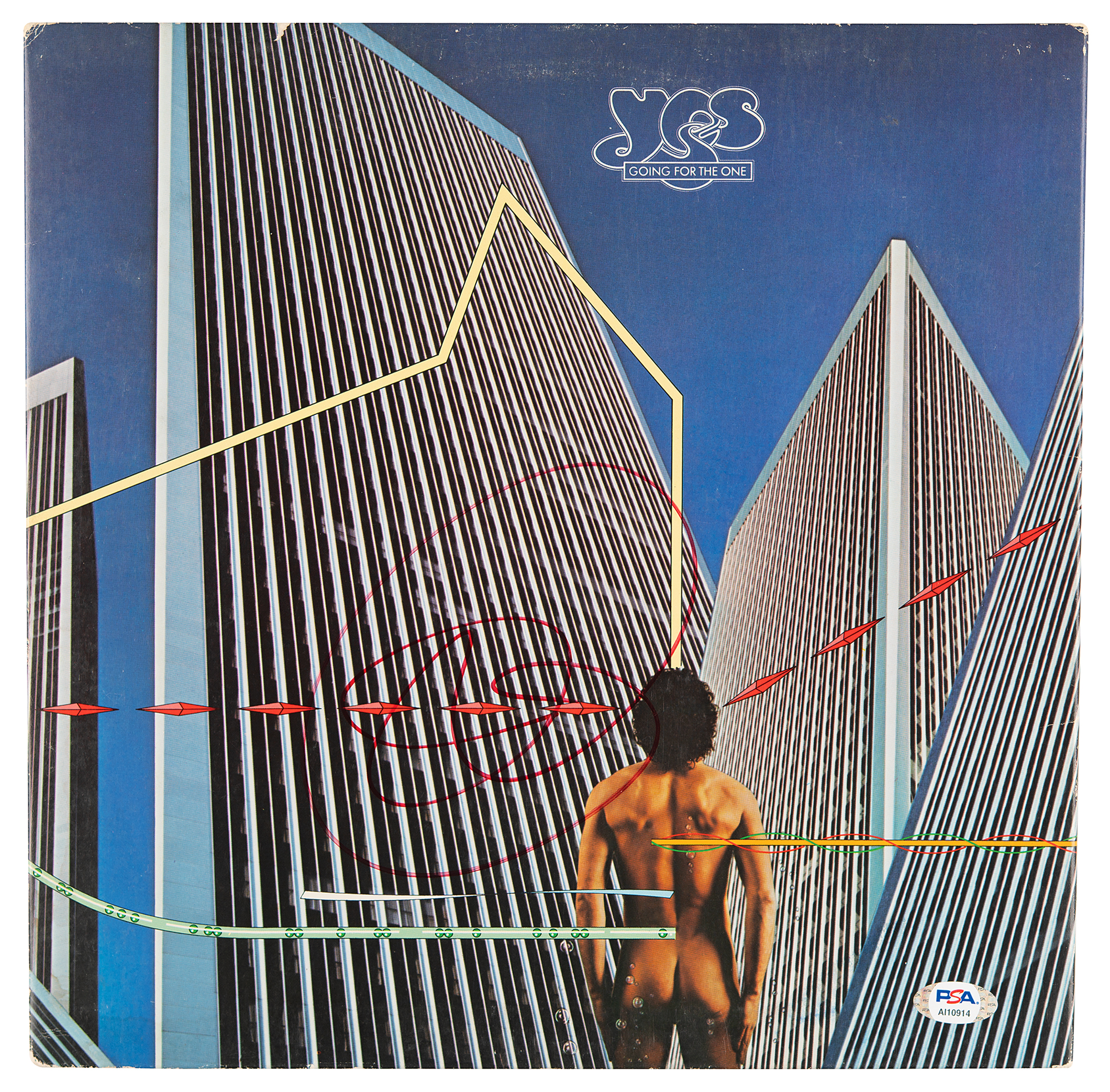 Going for the One album by Yes signed on the front cover in red felt tip by Jon Anderson. In fine condition, with a PSA/DNA authentication affixed to the lower right corner. The record is included.
