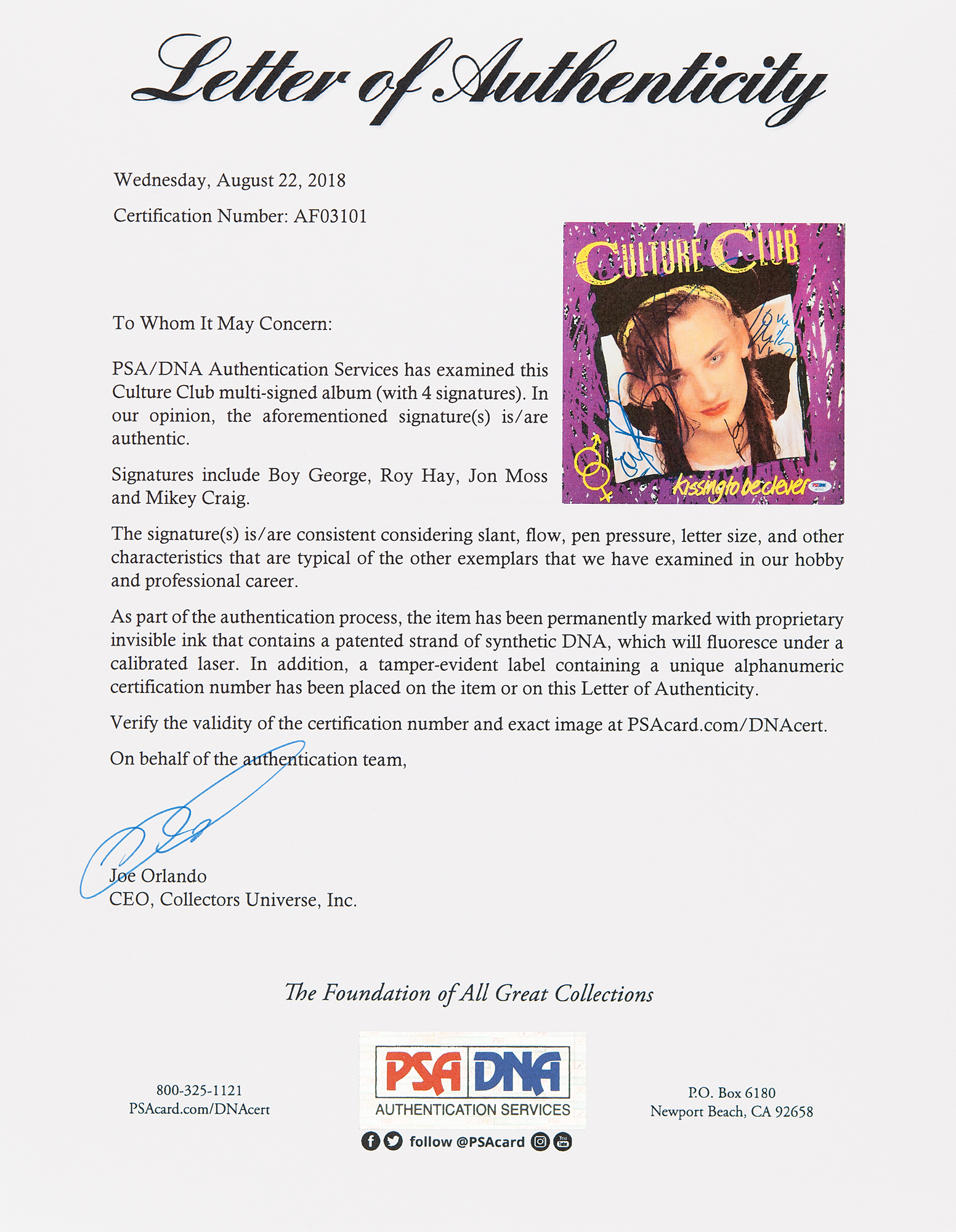 Kissing to Be Clever album signed on the front cover in blue felt tip by Boy George and Mikey Craig, and black felt tip by Roy Hay. In fine condition, with a PSA/DNA authentication label affixed to the lower right corner. The record is not included. Accompanied by a full letter of authenticity from PSA/DNA.