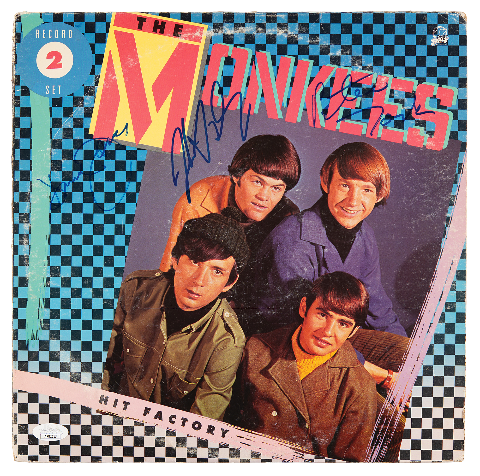 Hit Factory compilation album by The Monkees signed on the front cover in blue felt tip by Peter Tork, David Jones, and Mickey Dolenz. In fine condition, with a JSA authentication label affixed to the lower left corner. The record is included. Accompanied by a certificate of authenticity from JSA.