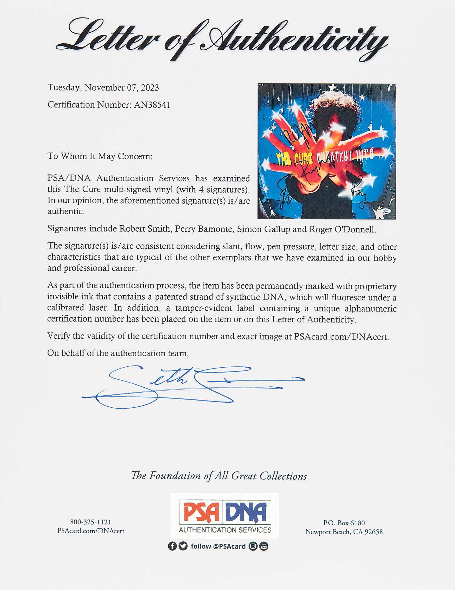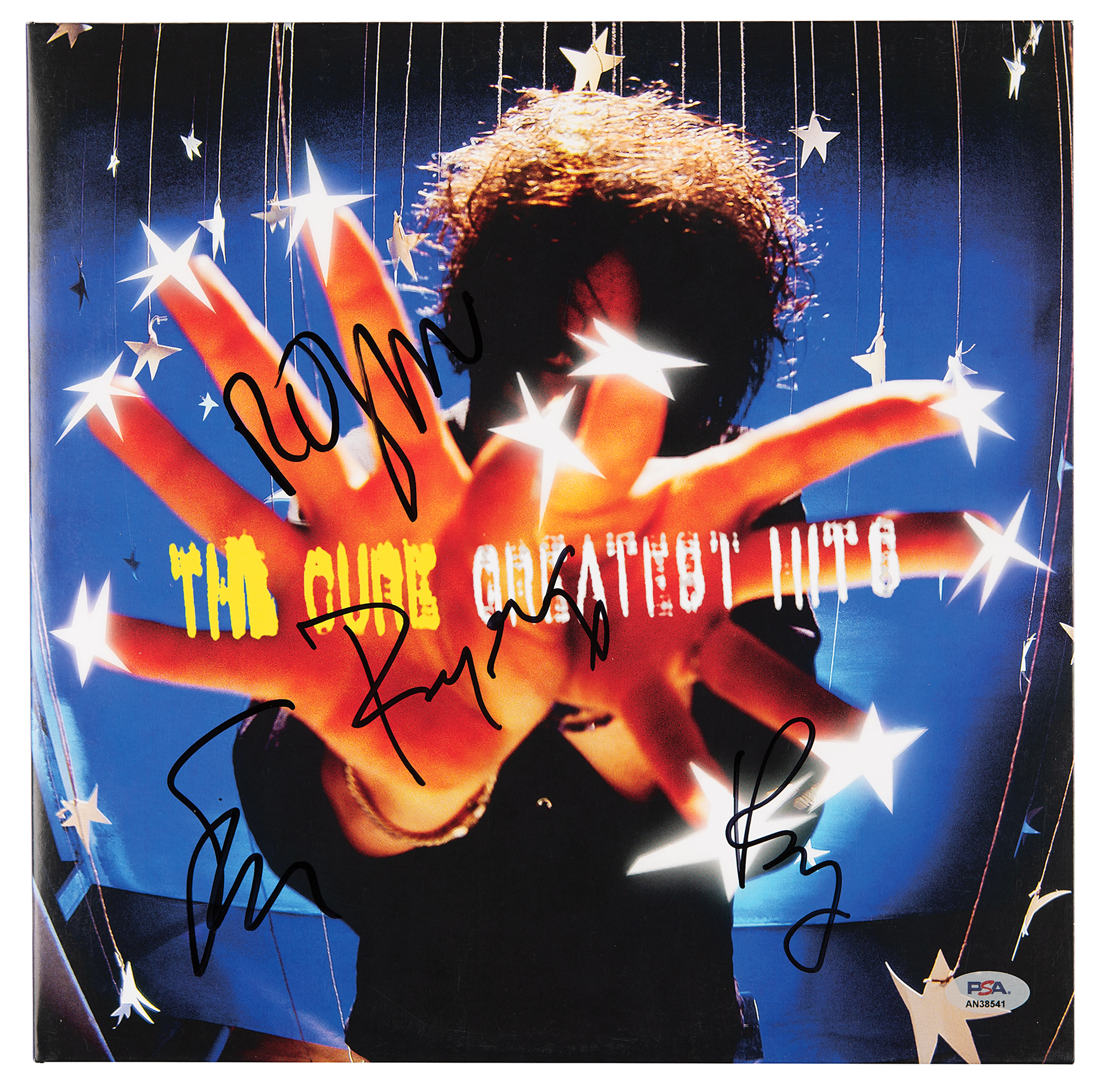Greatest Hits compilation album by The Cure signed on the front cover in black felt tip by Robert Smith, Perry Bamonte, Simon Gallup, and Roger O'Donnell. In fine condition, with a PSA/DNA authentication label affixed to the lower right corner. The record is not included. Accompanied by a full letter of authenticity from PSA/DNA.
