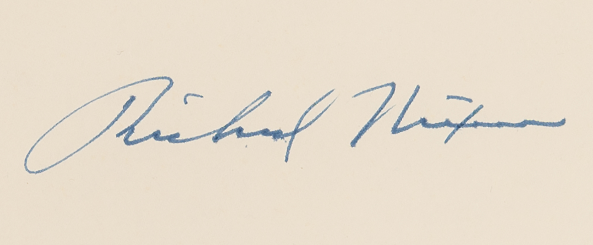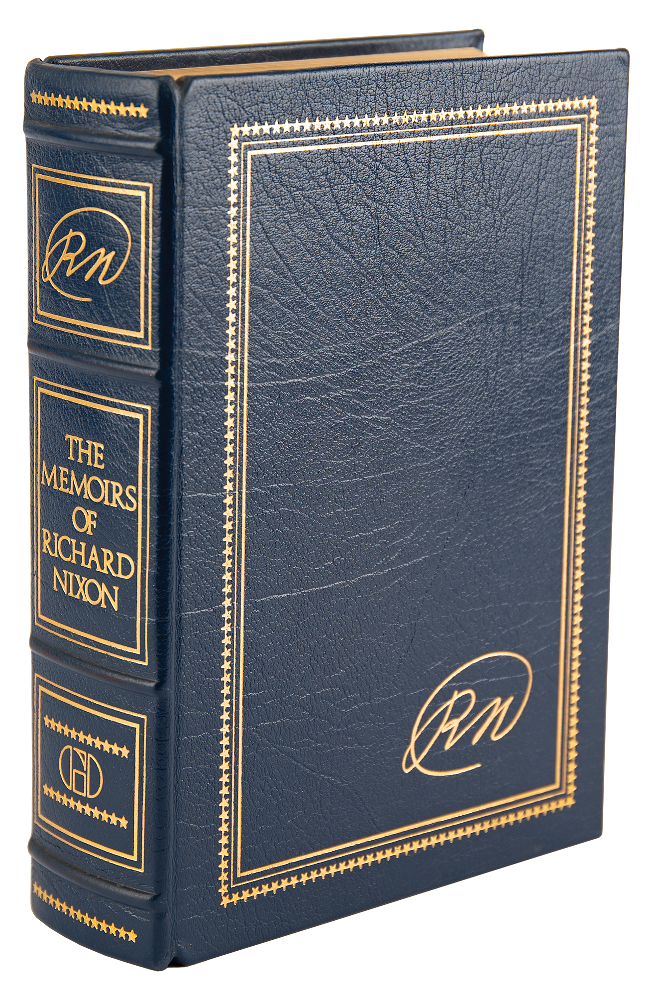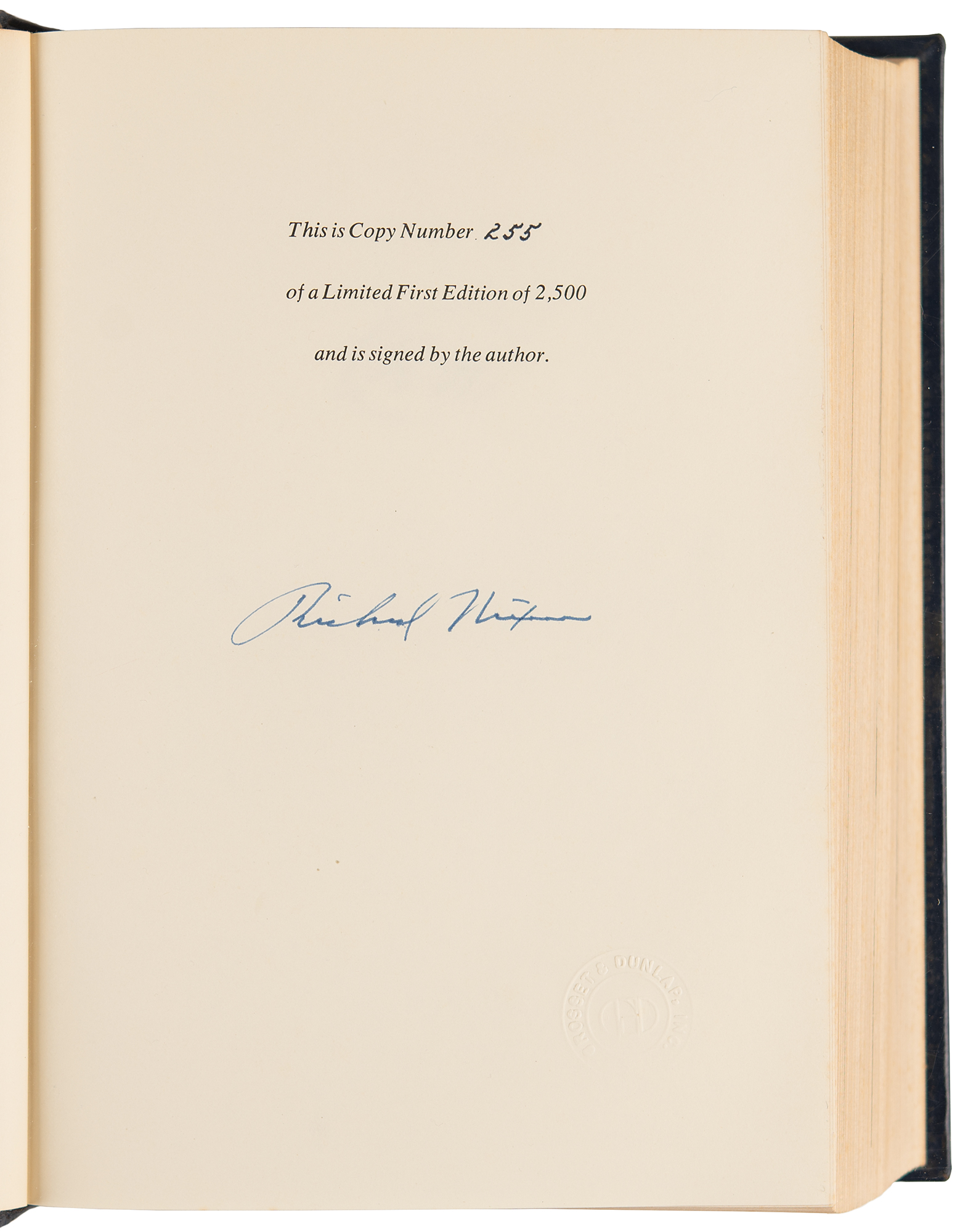 Signed book: The Memoirs of Richard Nixon. First edition, limited issue, numbered 255/2500. NY: Grosset & Dunlap, 1978. Leatherbound hardcover, 7 x 9.5, 1120 pages. Signed on the colophon in blue felt tip by Richard Nixon. In fine condition.