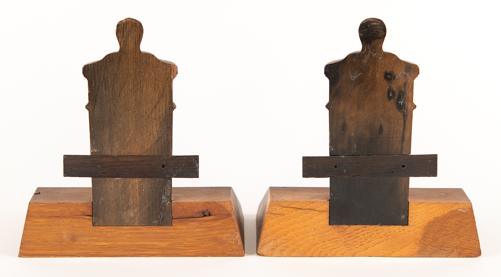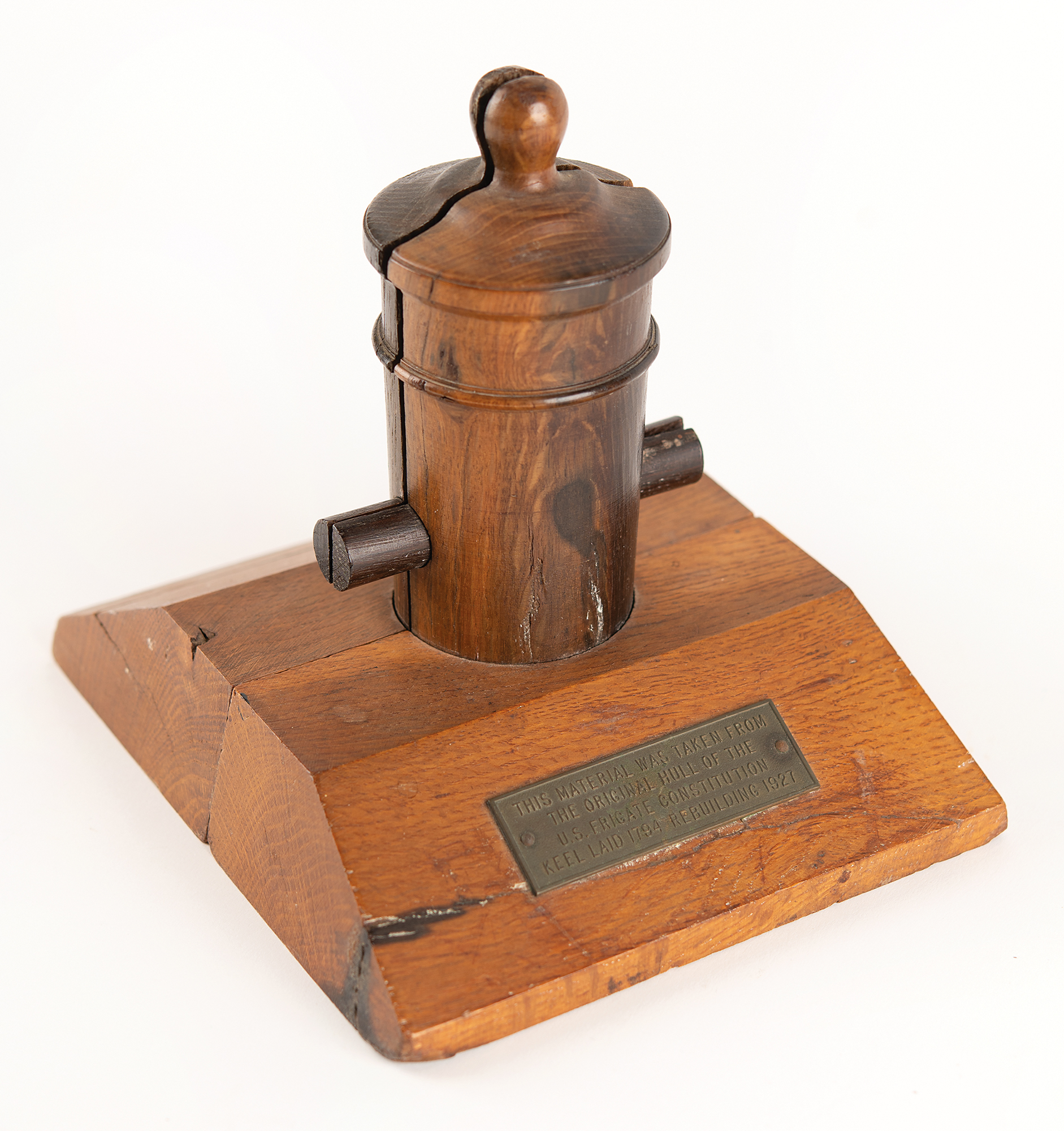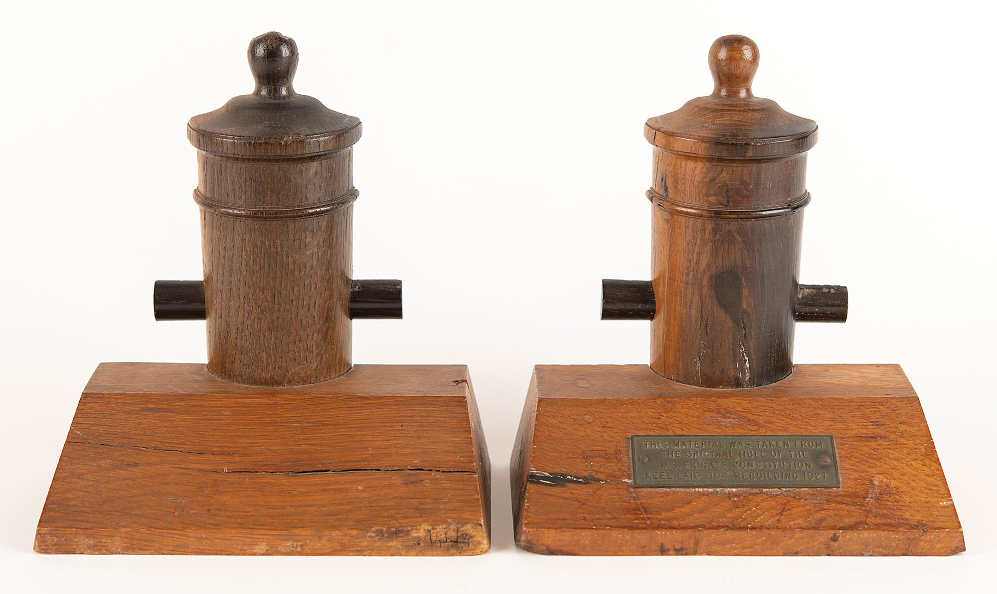 Fantastic pair of bookends fashioned from wood removed from the hull of the USS Constitution during the frigate's historic 1927 restoration, each measuring approximately 6.75˝ x 7.25˝ x 3.75˝, with one bearing the original bronze plate on the base, reading: "This material was taken from the original hull of the U.S. Frigate Constitution, Keel laid 1794, Rebuilding 1927." In fine condition.