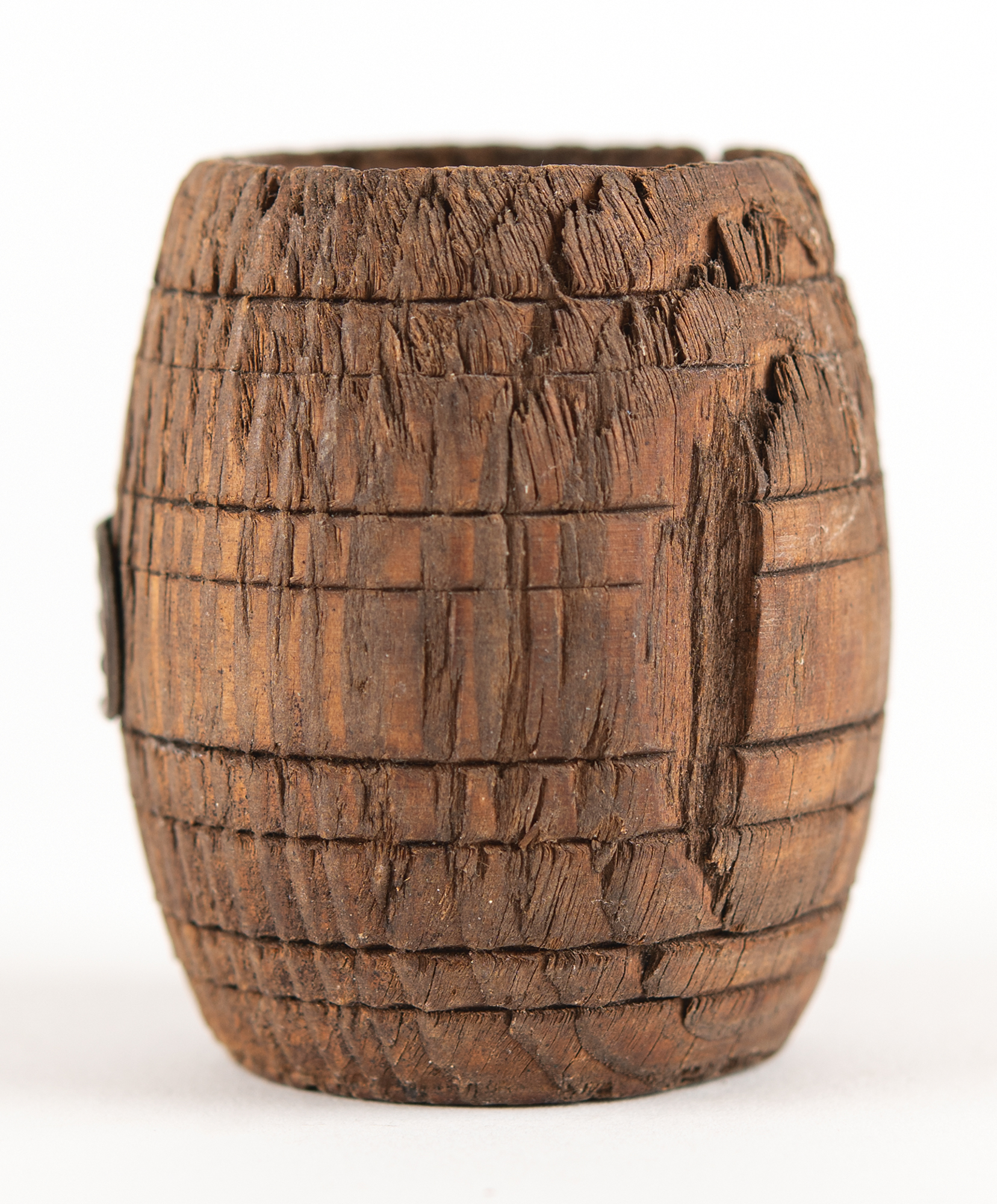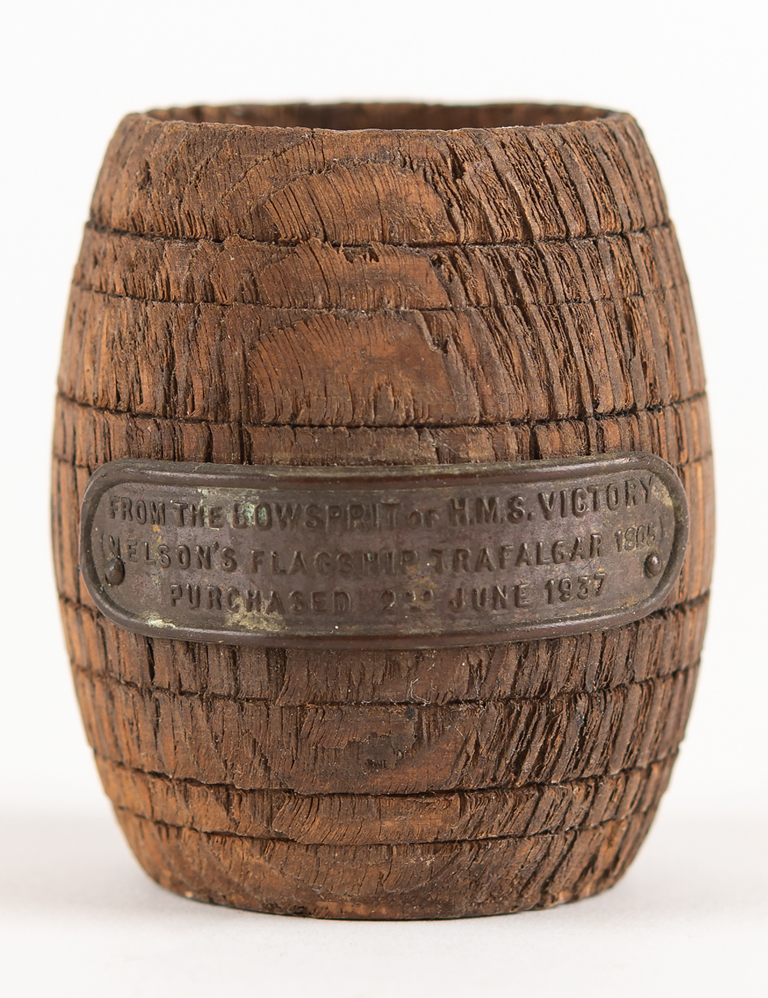 Desirable barrel-shaped matchstick holder, measuring approximately 2.25˝ tall and 2˝ in diameter, crafted from wood removed from the bowsprit from Horatio Nelson's flagship, the HMS Victory. A metal identification plaque on the front reads: "From the Bowsprit of HMS Victory, (Nelson's Flagship Trafalgar 1805), Purchased 2nd June 1937." In very good to fine condition, with moderate overall wear including a rough finish and a large chip to the rear.