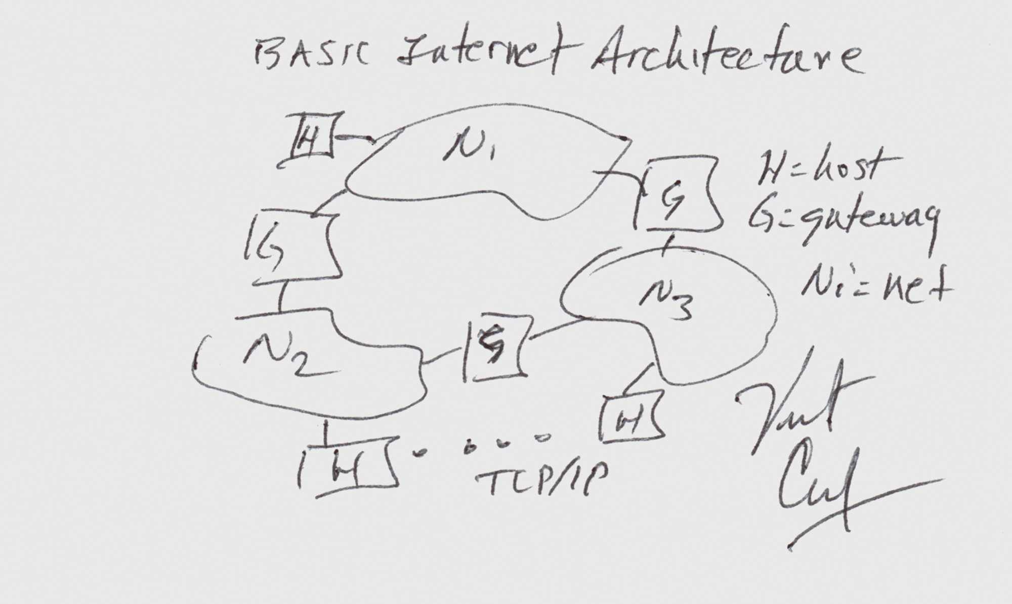 American Internet pioneer (born 1943) and one of 'the fathers of the Internet,' who developed TCP/IP technology and the first commercial email system. Original ballpoint sketch of the "Basic Internet Architecture" accomplished by Vint Cerf on a white 5 x 3 card, signed at the bottom, "Vint Cerf." The sketch shows a basic diagram of the connections between gateways, hosts, and networks. In very fine condition.