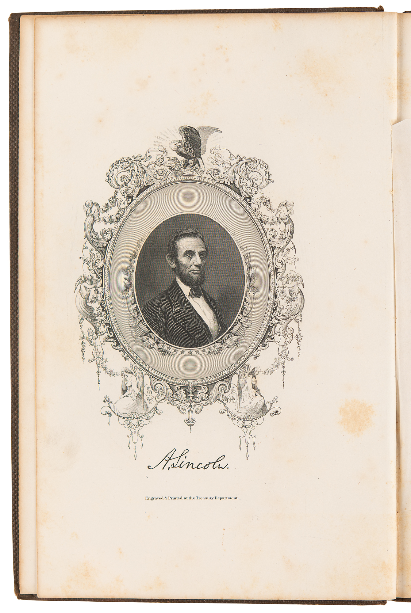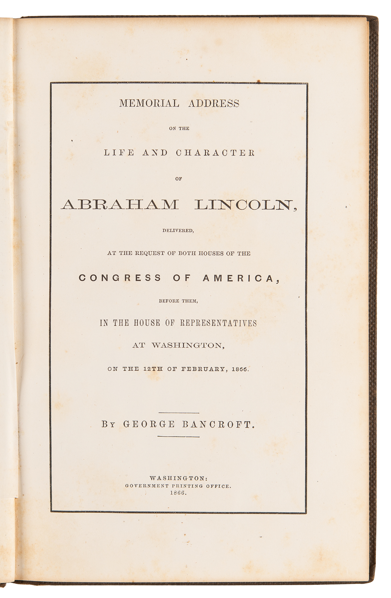 Desirable book: Memorial Address on the Life and Character of Abraham Lincoln, delivered, at the request of both houses of the Congress of America, before them, in the House of Representatives, at Washington, on the 12th of February, 1866, by George Bancroft. Washington: Government Printing Office, 1866. Hardcover bound in brown cloth with gilt-stamped title, 6 x 9, 69 pages. Book condition: G+/None, edgewear, rubbing to boards, a pencil ownership inscription to the first free end page, and foxing to textblock (heaviest to endpapers).