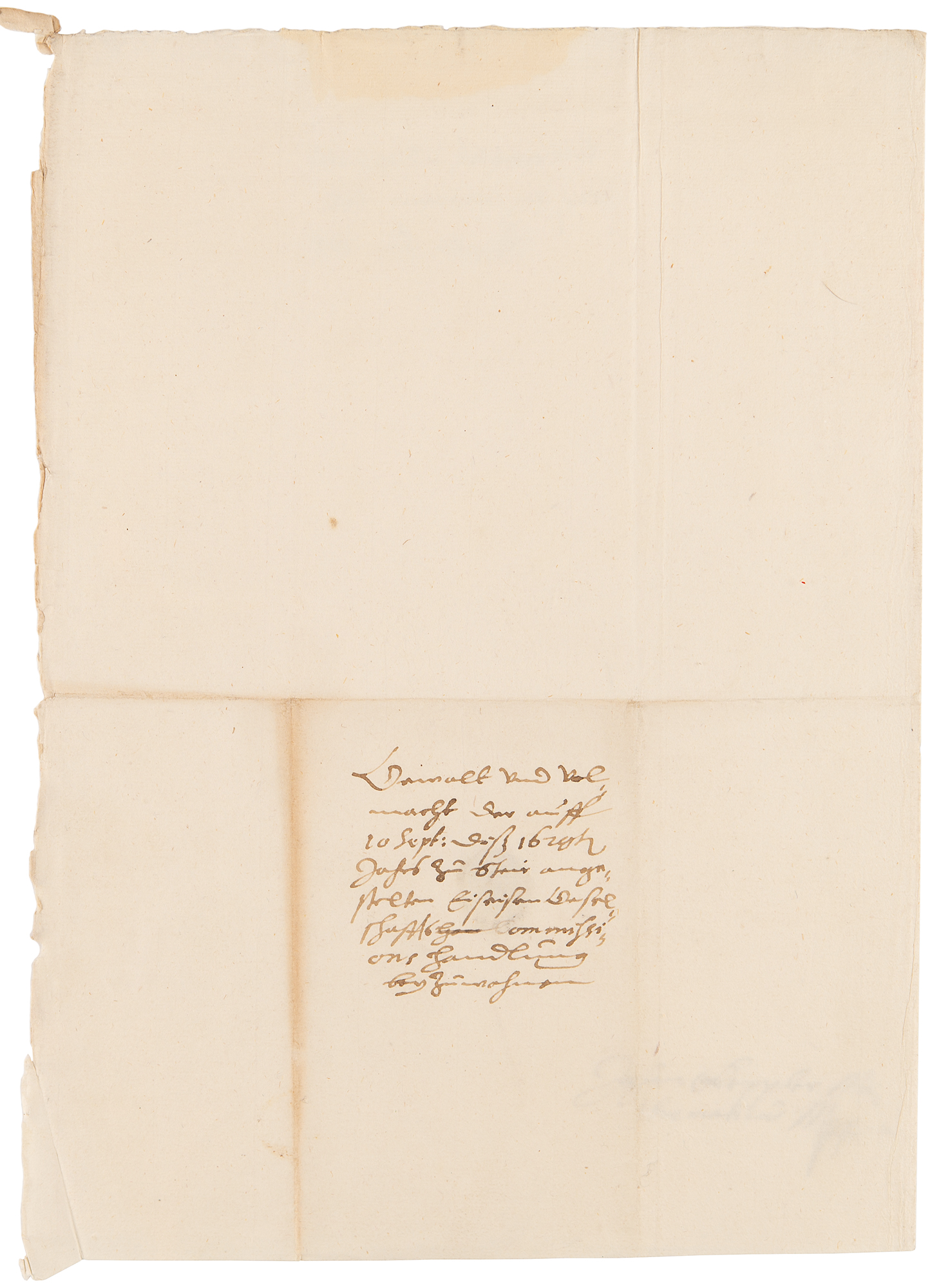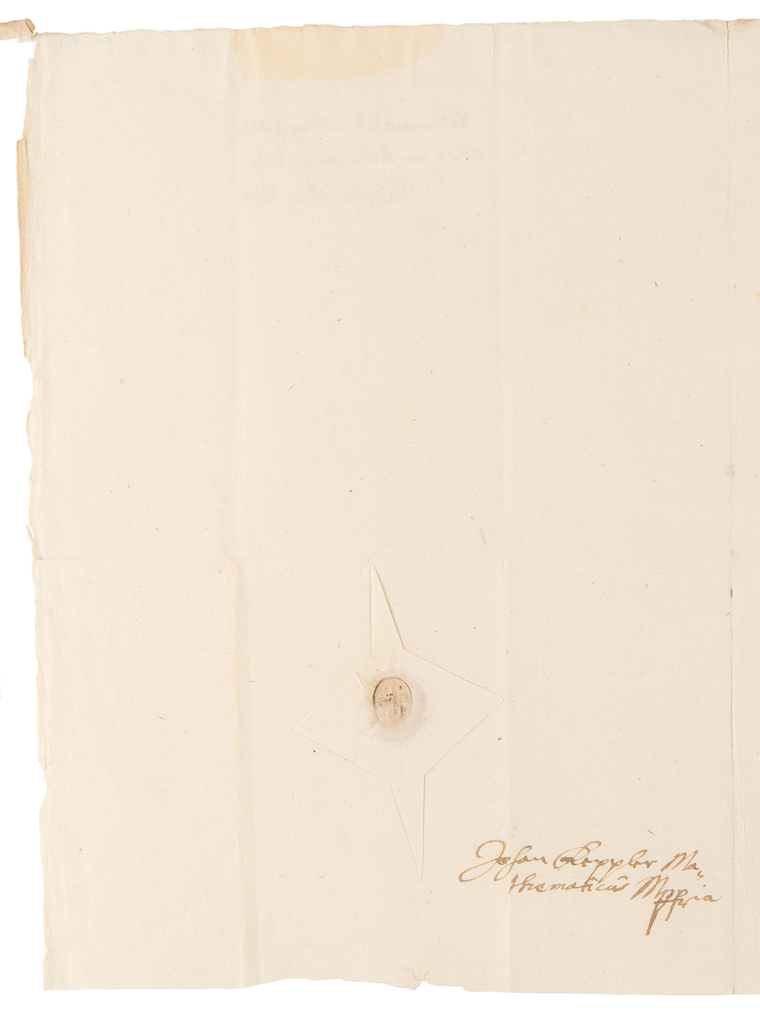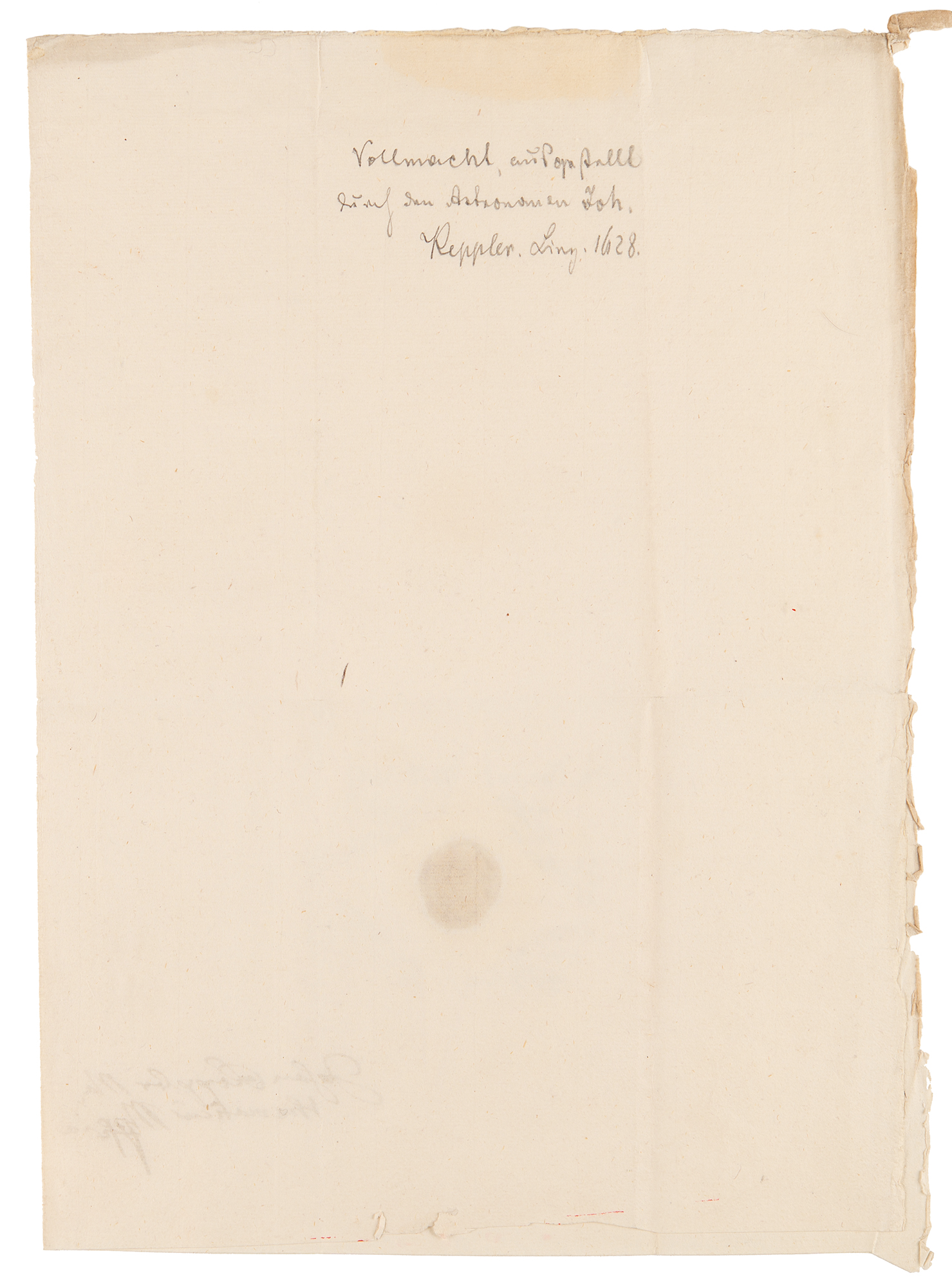 German mathematician, astronomer and astrologer (1571-1630) best known for his eponymous laws of planetary motion. ADS in German, signed “Johan Keppler, Mathematicus Mppria,” two pages on two adjoining sheets, 8.25 x 11.5, no date but circa August/September 1628. Kepler authorizes the bearer to attend the Steyr Iron Corporation's committee hearing scheduled for September 10, 1628, writing (translated): "Power and authority to attend the action of the Iron Company Commission established in Steyr on 10 September of this year 1628." He signs the second integral leaf beside his fine papered seal, showing Kepler's arms and initials, "I. K." In fine to very fine condition.