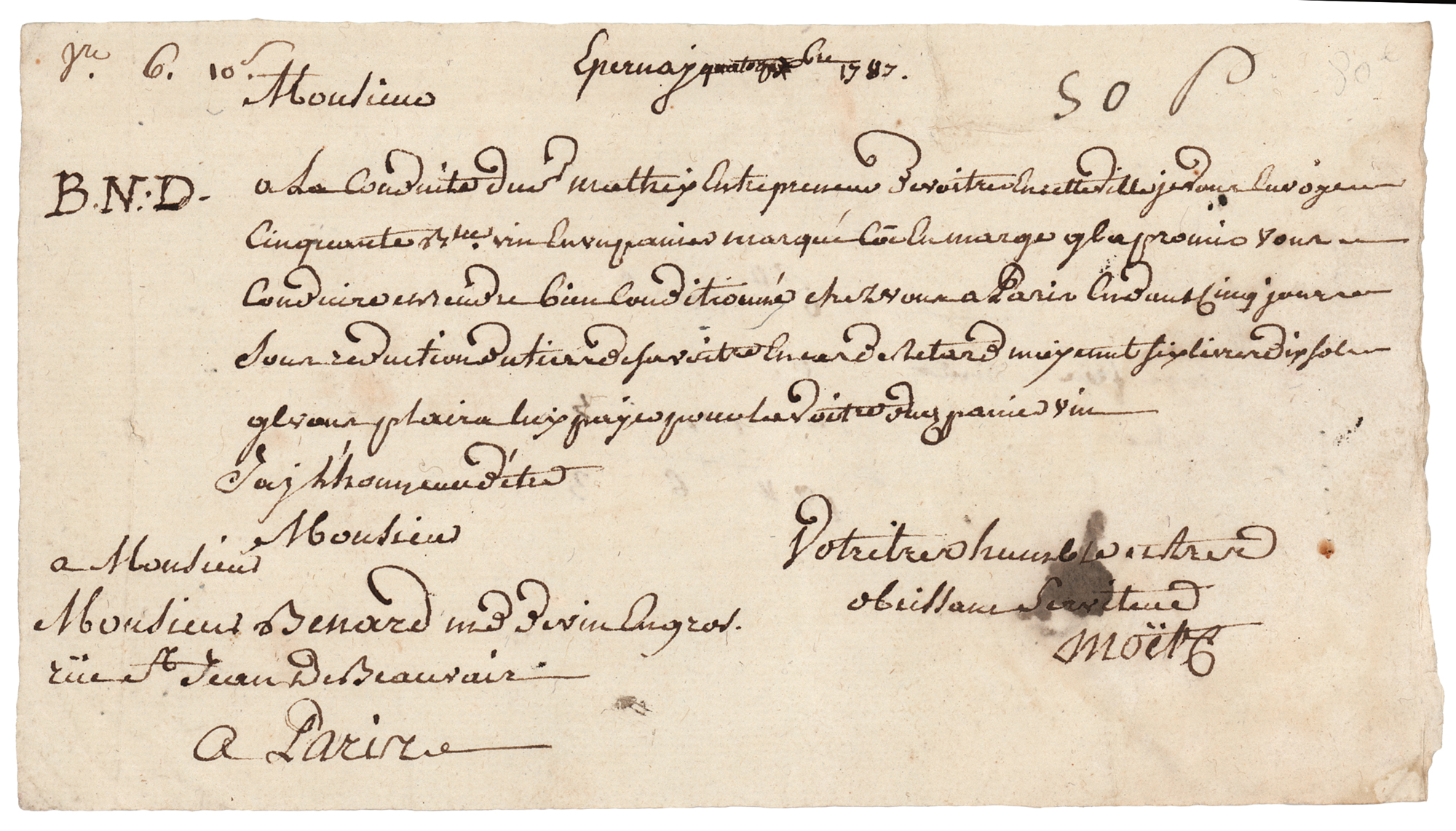 French vintner and merchant seaman (1758–1841) who helped bring the Champagne house of Moët et Chandon to international prominence, having inherited the winery from his grandfather and founder Claude Moët. ADS in French, signed “Moet,” one page, 8.25 x 4.75, October 14, 1787. Handwritten receipt of a delivery to Benard, wine dealer at rue Saint Jean de Veaucaire in Paris, for 50 bottles of 'well-conditioned' champagne, including the invoice amount and instructions. In fine condition, with a stain above, but not touching, the signature.