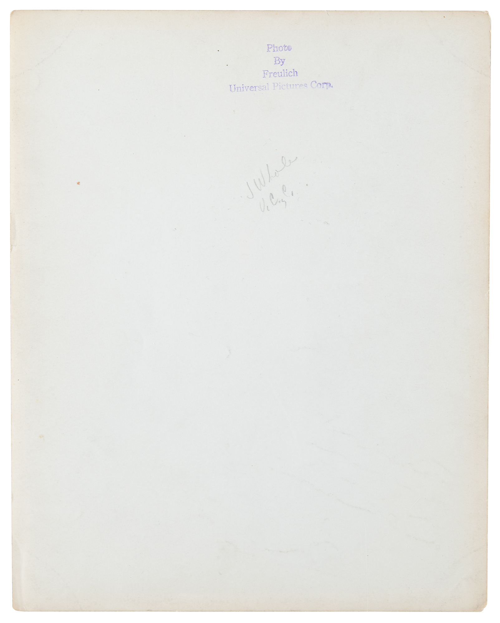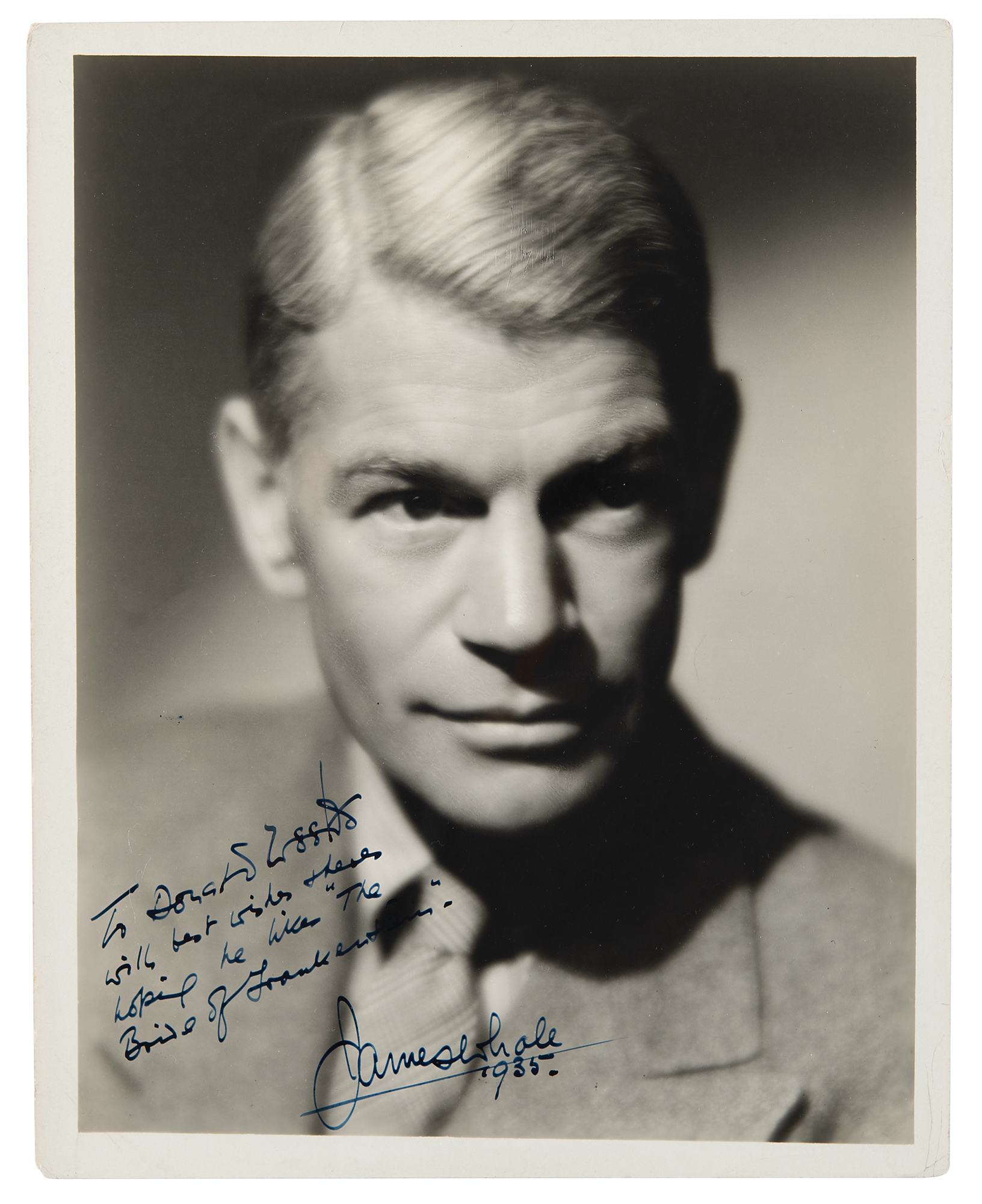 Vintage glossy 8 x 10 Universal Pictures publicity portrait of the celebrated horror director, boldly signed and inscribed in fountain pen, "To Donald Weeks, with best wishes & here's hoping he likes 'The Bride of Frankenstein'—James Whale, 1935.” Reverse bears a Roman Freulich/Universal Pictures credit stamp. In fine condition, with scattered small surface creases. Autographs of Whale are extremely rare in any form, and signed photographs of this size and quality are of the utmost desirability—the reference to his classic movie, The Bride of Frankenstein, enhances this example even further.