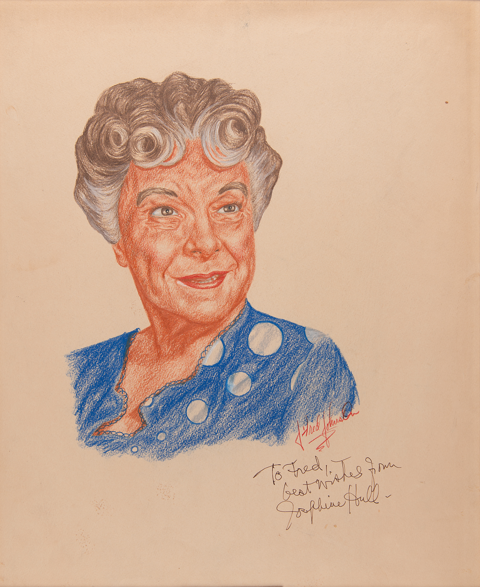 American stage and screen actress (1877-1957) who won the 1950 Academy Award for Best Supporting Actress for her role in Harvey. Original vintage graphite and colored pencil portrait sketch of Josephine Hull accomplished by artist J. Fred Johnson on an off-white 13 x 16 sheet, signed and inscribed in ink, "To Fred, best wishes from Josephine Hull." Also signed in red pencil by the artist. Matted to an overall size of 16 x 20. In fine condition, with light toning from prior display.