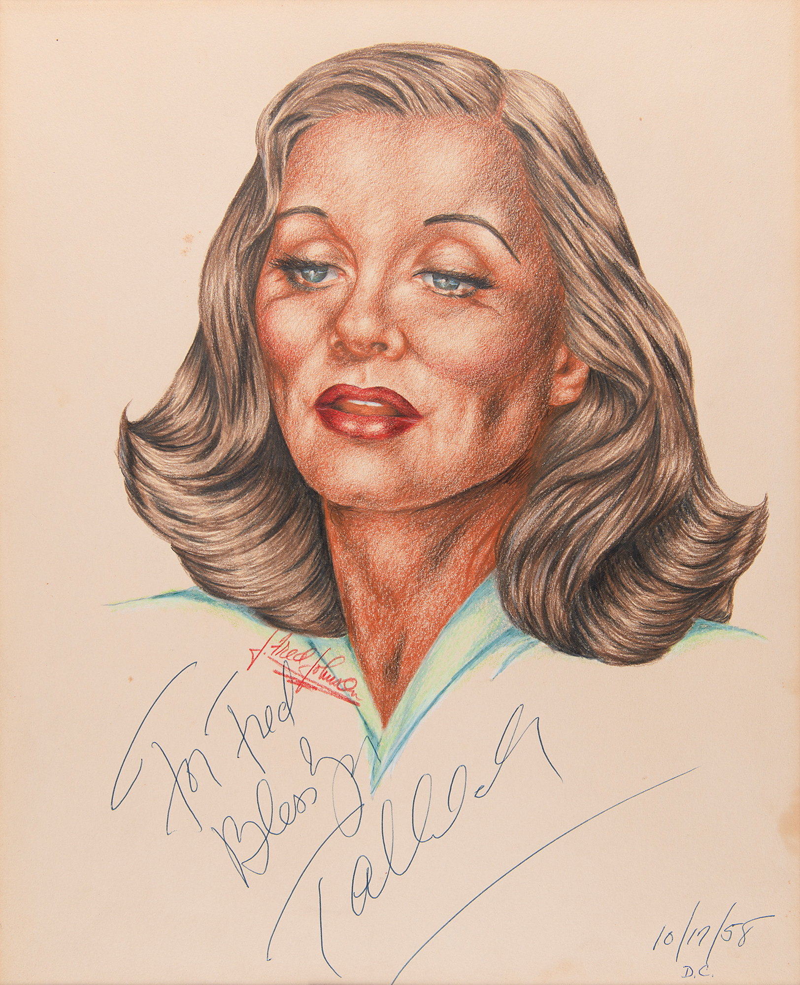 Original vintage graphite and colored pencil portrait sketch of Tallulah Bankhead accomplished by artist J. Fred Johnson on an off-white 13 x 16 sheet, signed and inscribed in blue ballpoint, "For Fred, Bless you, Tallulah." Also signed in red pencil by the artist. Matted to an overall size of 16 x 20. In fine condition, with light toning from prior display.