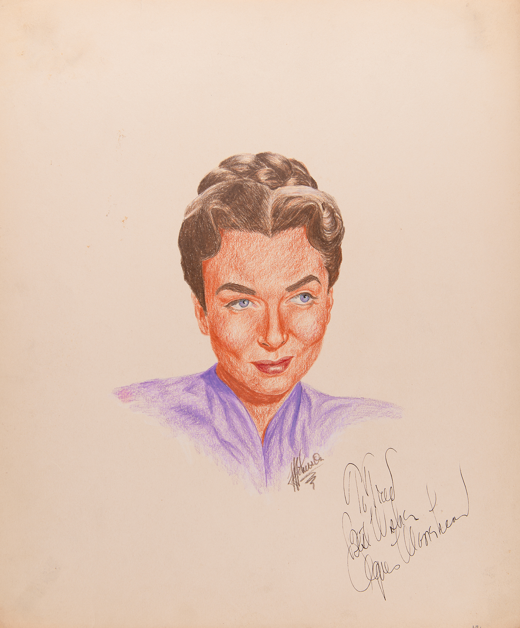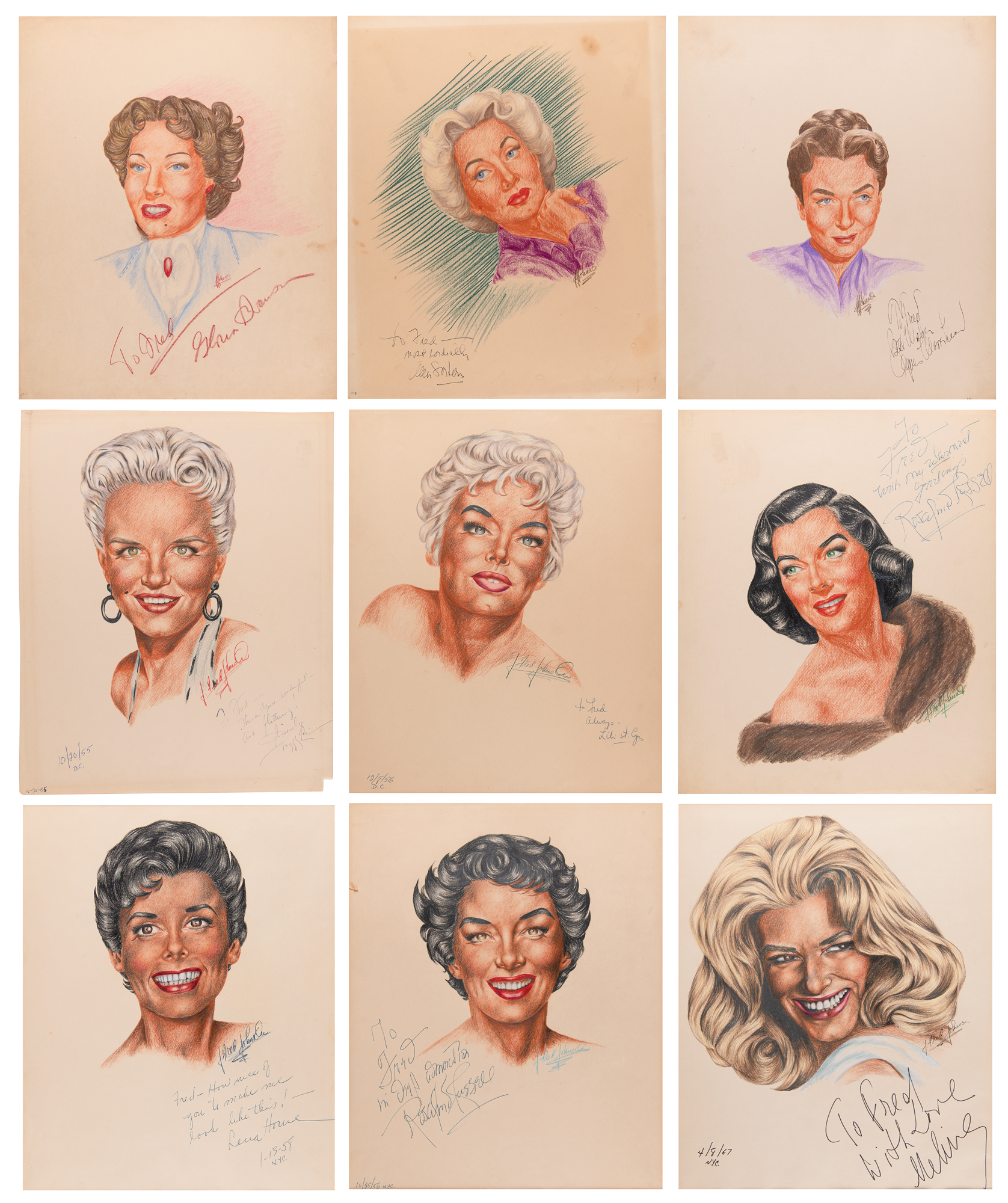 Collection of nine original vintage portrait sketches of classic actresses from the Golden Age of Hollywood, all of which are signed in ink or colored pencil by the pictured starlet and inscribed to the artist, J. Fred Johnson. The oversized sketches are accomplished in graphite and colored pencil on off-white sheets of drawing paper, approximately 13.5 x 16.5, and include the following actresses: Gloria Swanson, Ann Sothern, Agnes Moorehead, Peggy Lee, Lili St. Cyr, Rosalind Russell (2), Lena Horne, and Melina Mercouri. Each is also signed in pencil by the artist, and several are matted to an overall size of 16 x 20. In overall very good to fine condition.