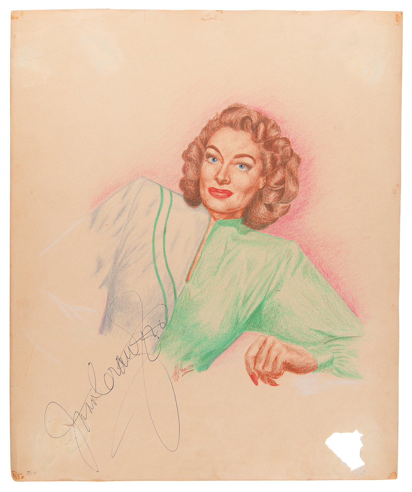 Collection of nine original vintage portrait sketches of classic actresses from the Golden Age of Hollywood, all of which are signed in ink by the pictured starlet, the majority of which are inscribed to the artist, J. Fred Johnson. The oversized sketches are accomplished in graphite and colored pencil on off-white sheets of drawing paper, approximately 13.5 x 16.5, and include the following actresses: Joan Fontaine, Shirley Booth, Jessica Tandy, Joan Crawford, Lee Grant, Patricia Neal, Myrna Loy, Lauren Bacall, and Deborah Kerr. Each is also signed in pencil by the artist, and several are matted to an overall size of 16 x 20. In overall very good to fine condition, with tears and paper loss to Crawford and Grant.
