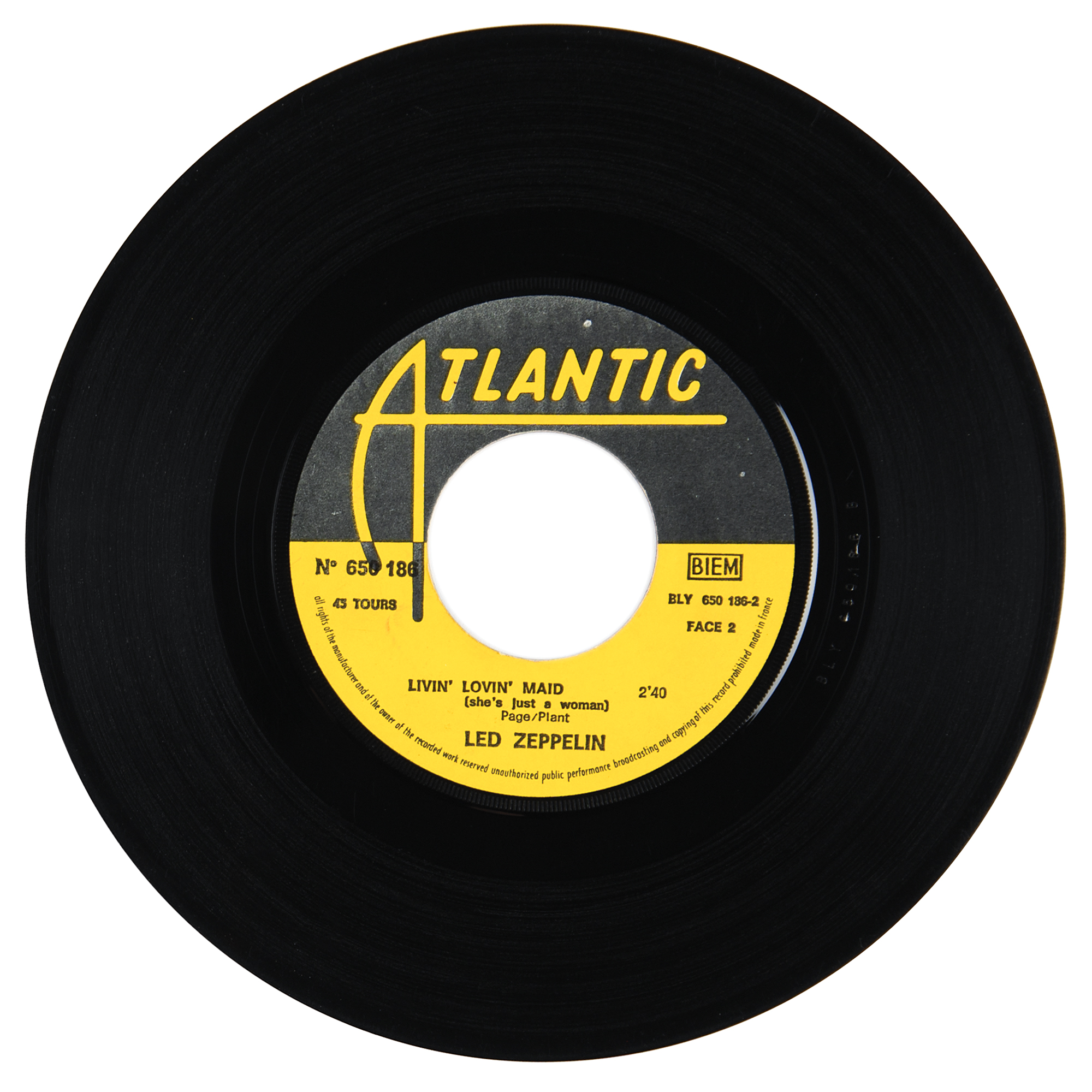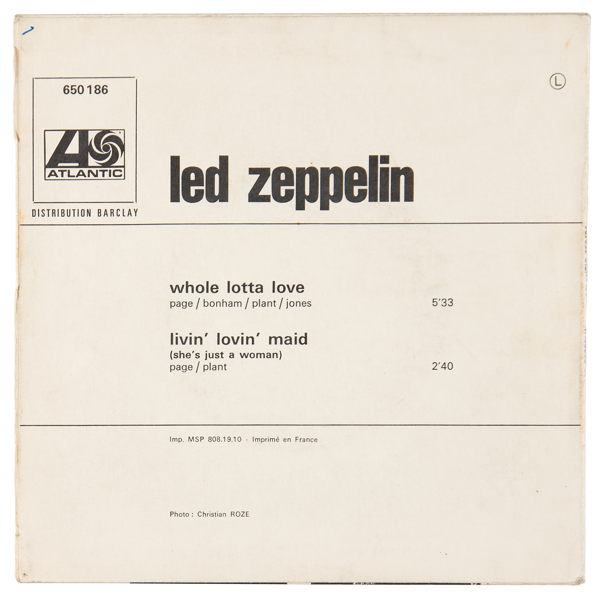 Amazing Atlantic Records (France) 45 RPM record for the Led Zeppelin single ‘Whole Lotta Love / Livin’ Lovin’ Maid (She's Just a Woman),’ signed on the front cover in blue ballpoint by Robert Plant, Jimmy Page, and John Bonham. In fine condition. The record is included. A magnificent signed Led Zeppelin single that boasts an attractive retro design with big letters, bold colors, and a terrific full-band image. ‘Whole Lotta Love’ represents a classic Led Zeppelin song and the group's first big hit in the United States, where it eventually reached gold status. A must-own rock n’ roll rarity.