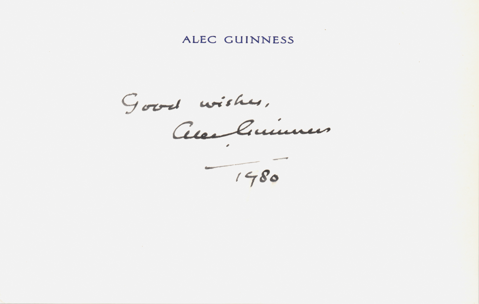 Ink signature, "Good wishes, Alec Guinness, 1980,” on an off-white 5.5 x 3.5 card. In very fine condition. Accompanied by a photo of Guinness as Obi-Wan Kenobi in Star Wars.