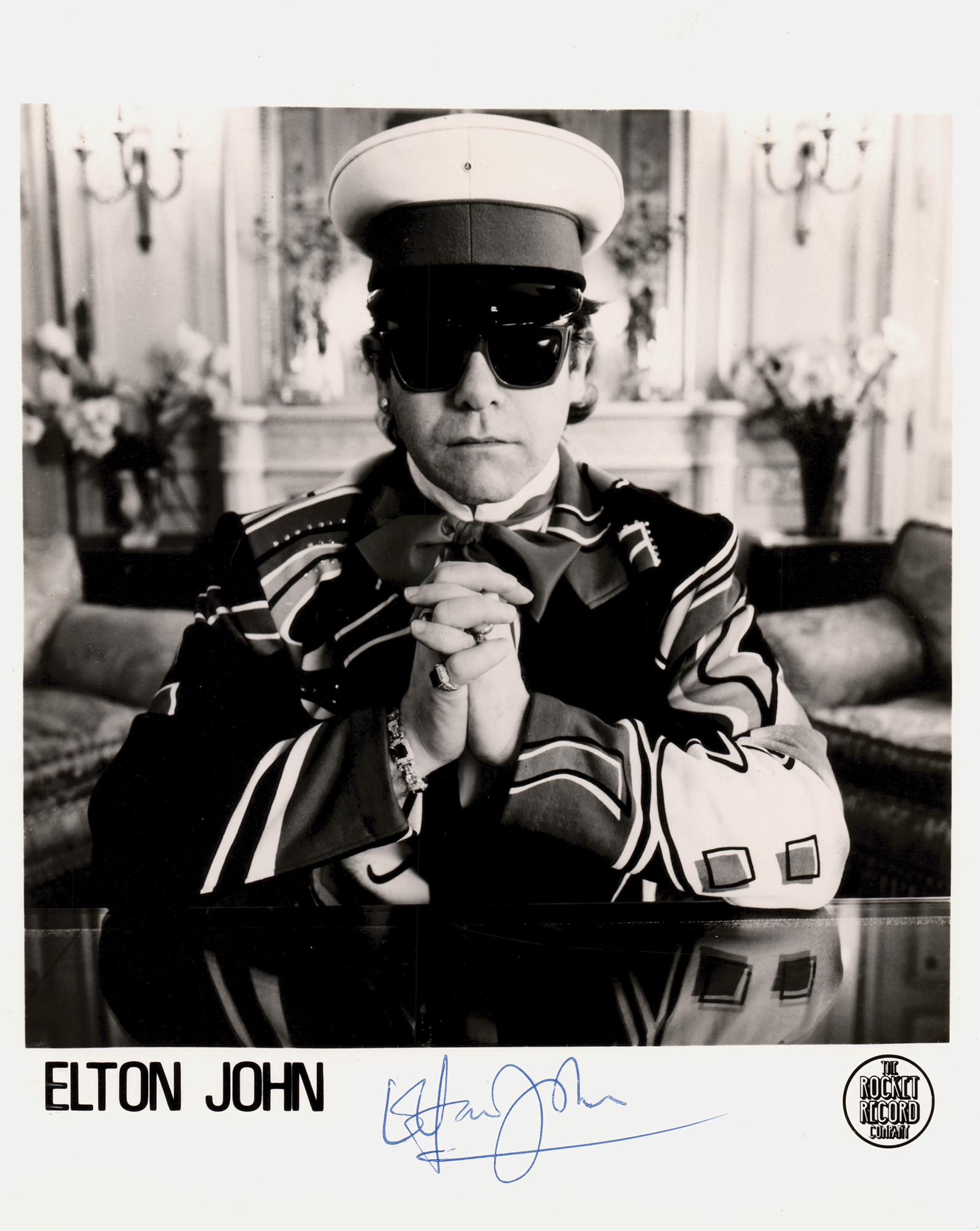 Glossy 8 x 10 Rocket Record Company publicity photo of Elton John seated at a table in a serious half-length pose with his hands clasped, signed neatly in the lower border in blue ballpoint. In fine condition.