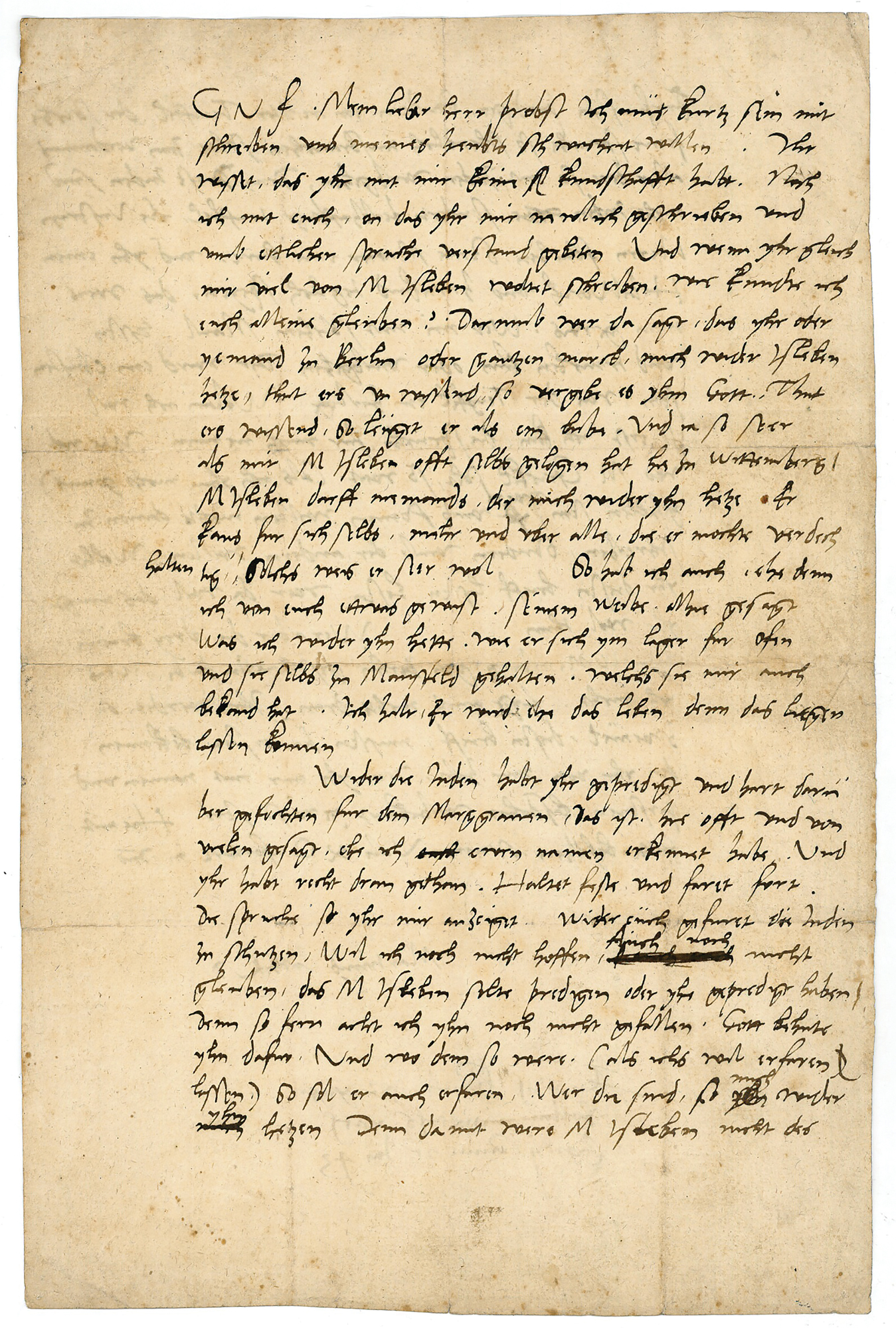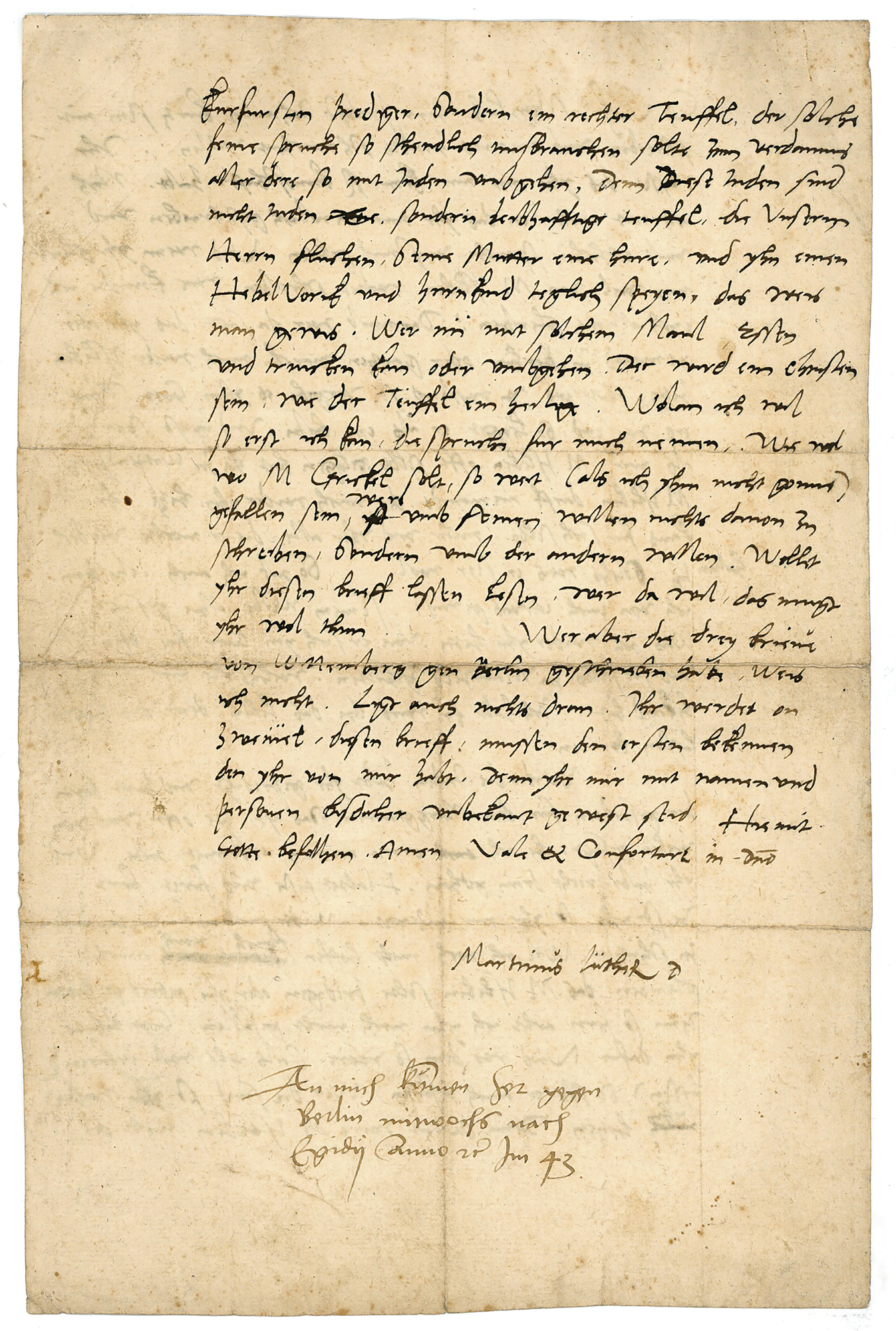 Provenance: before 1914 nothing more of the letter was known than the words branding Agricola an incorrigible liar (“will give up his life before he gives up his lying”), which Buchholzer had hurled at his adversary during a disputation as late as 1562, offering to show him the passage in Luther’s letter. In the early 19th century, the editors of Agricola’s writings confessed that such a letter could not be found (cf. B. Kordes, Agricola’s Schriften möglichst vollständig verzeichnet [Altona 1817], p. 393: “To my knowledge, this letter does not exist”). Only in 1914 was it discovered in the collection of Baron Heinrich von Hymmen (1880–1960), and in the same year the theologian G. Kawerau published it in the appendix to volume 15 of Luther’s letters. It was still in the Hymmen collection in 1947 when the critical Weimar edition published it, based on a photograph. The Hymmen family is known to have supported the Protestant cause: during the Nazi era, Heinrich placed his Unterbach castle at the disposal of the illegal Confessing Church; the theologian Johannes Hymmen was Vice President of the “Evangelischer Oberkirchenrat” from 1936. The letter first surfaced in the trade more than three decades ago (Stargardt 630 [1983], lot 1238). References: Luther, Werke: Kritische Gesamtausgabe, Briefwechsel vol. 10 (Weimar 1947), no. 3909 (pp. 388-391). First published in: Enders-Kawerau XV, no. 3309a (pp. 359-362). In modernized spelling: Kawerau, ‘Ein Brief Luthers an den Propst von Berlin, Georg Buchholzer,’ in: Schriften des Vereins für die Geschichte Berlins 50 (1917), pp. 430-436.