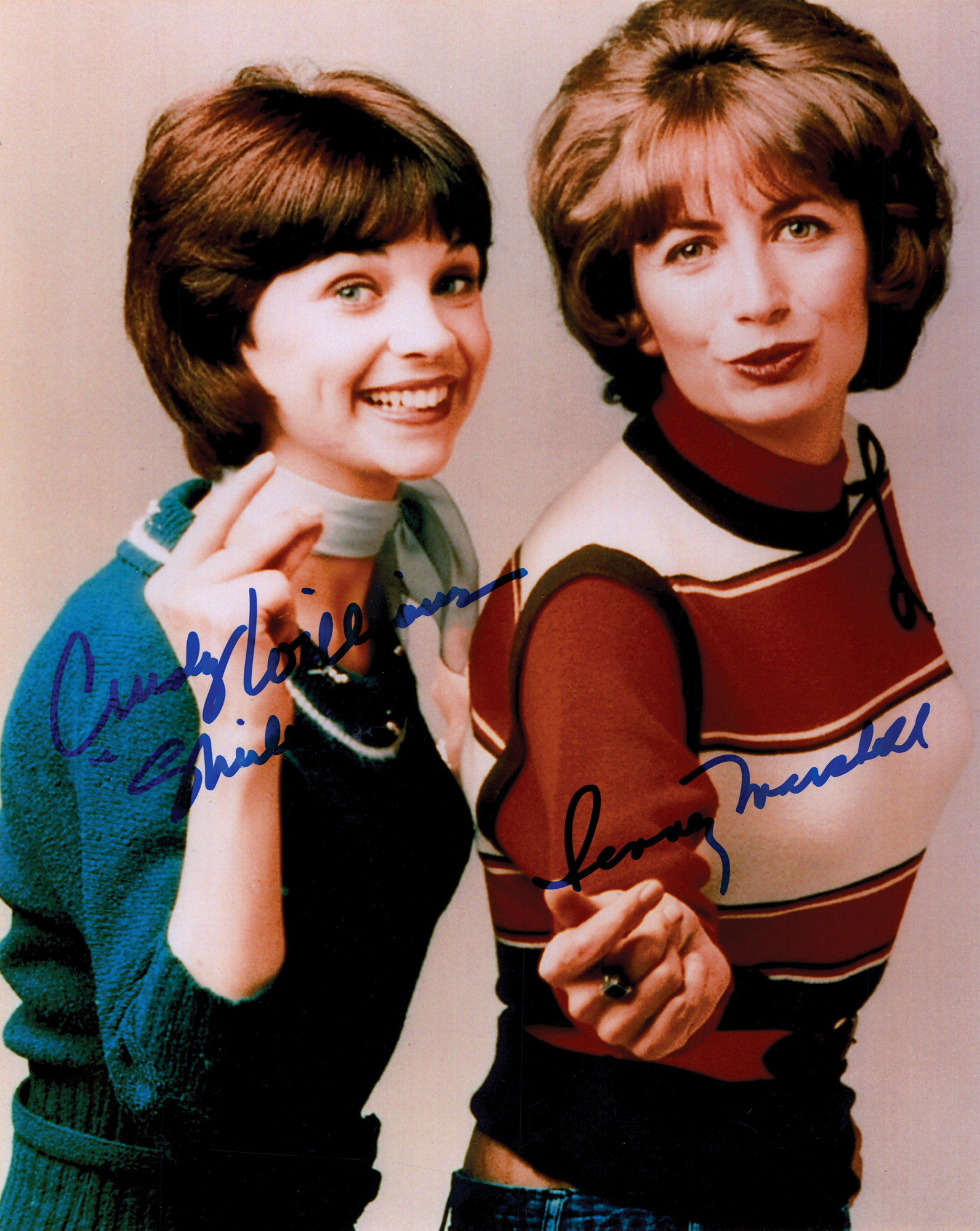 Color glossy 8 x 10 photo of Penny Marshall and Cindy Williams as Laverne and Shirley, signed in blue felt tip by both. In very fine condition. Originally obtained by in-person specialist Mike Wehrmann.