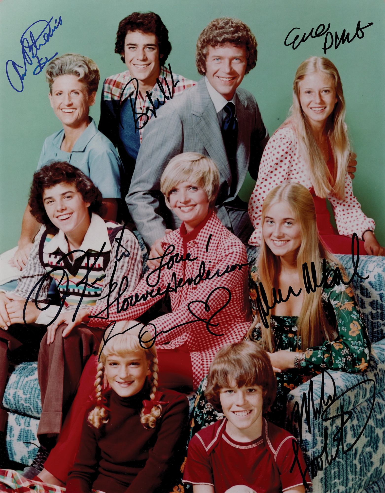 Color glossy 11 x 14 photo of the cast of The Brady Bunch, signed in black felt tip by Florence Henderson, Barry Williams, Christopher Knight, Mike Lookinland, Maureen McCormick, Eve Plumb, and Susan Olsen, and in blue felt tip by Ann B. Davis. In fine condition, with mild surface scuffing. Accompanied by a full letter of authenticity from JSA.