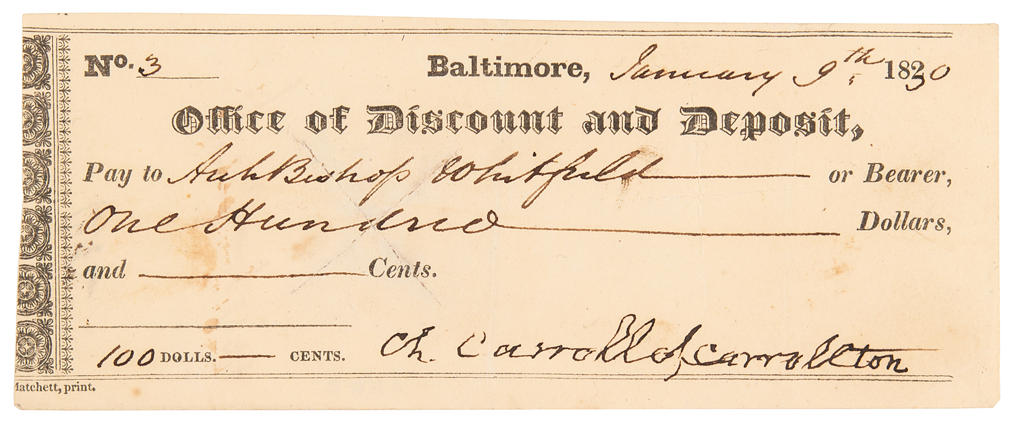 Signer of the Declaration of Independence from Maryland (1737-1832) who was the longest-lived among his colleagues. Office of Discount and Deposit check, 6.5 x 2.75, filled out in another hand and signed by Carroll, "Ch. Carroll of Carrollton," payable to Archbishop Whitfield for $100, January 9, 1830. In fine condition. James Whitfield (born 1770) was an English-born prelate of the Roman Catholic Church in the United States who served as archbishop of the Archdiocese of Baltimore in Maryland from 1828 until his death in 1834. Whitfield is known for hosting the first two provincial councils of American bishops, where policies for running the new American Catholic Church were established. He is also known for spending his personal fortune to build churches and sponsor priests, and for his assistance to the African-American community.