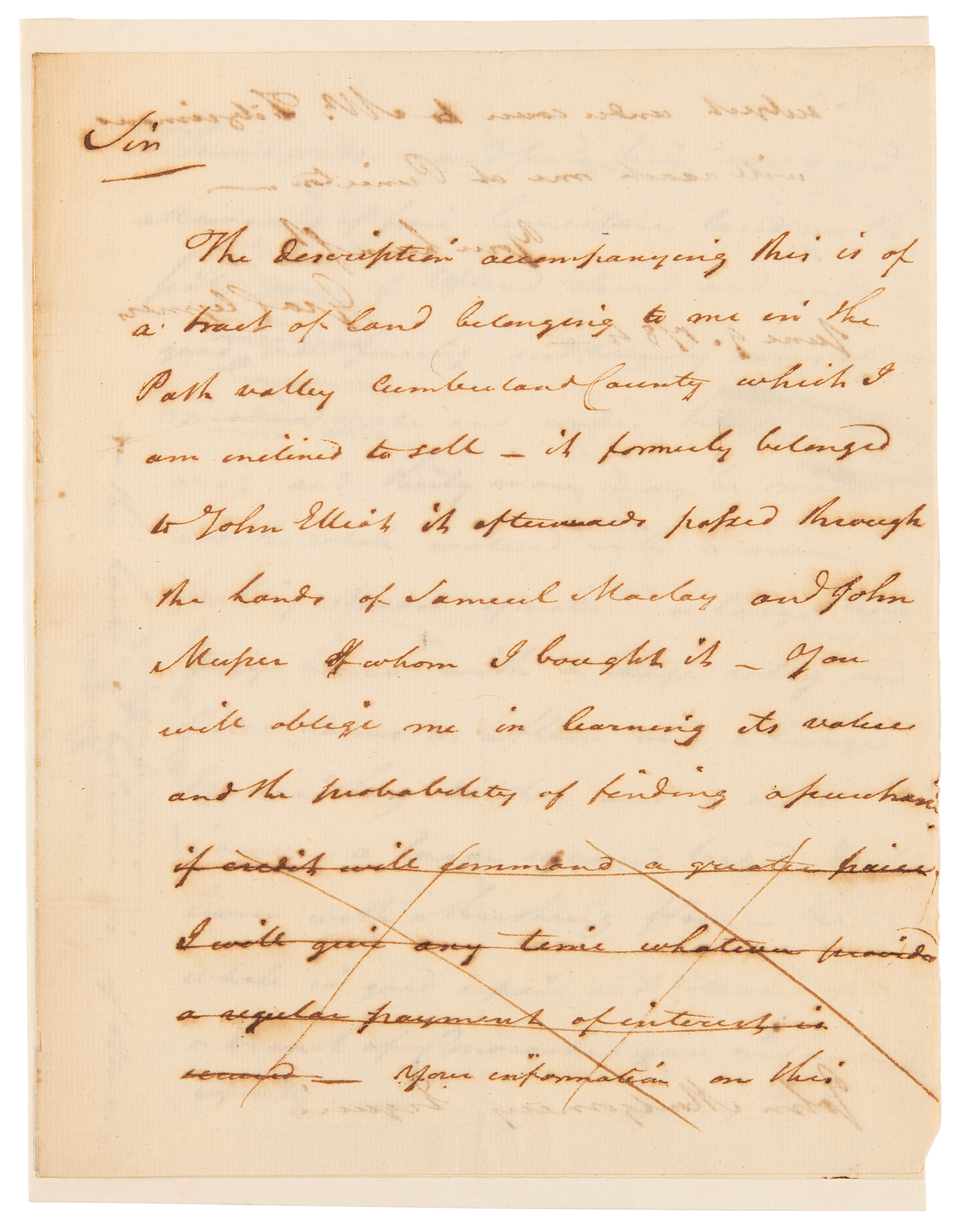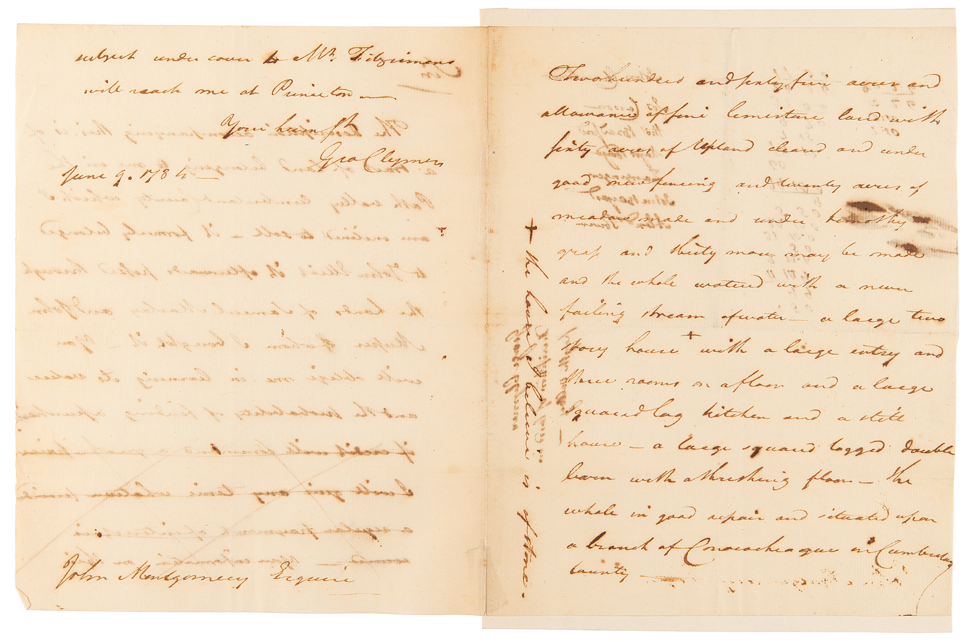 Signer of the Declaration of Independence from Pennsylvania (1739–1813) who served as the first president of the Philadelphia Bank. ALS signed “Geo. Clymer,” three pages on two adjoining sheets, 7.25 x 9, June 9, 1784. Handwritten letter to John Montgomery, in part: “The description accompanying this is of a tract of land belonging to me in the Path Valley Cumberland County which I am inclined to sell — it formerly belonged to John Elliot it afterwards passed through the hands of Samuel Maclay…of whom I bought it. You will oblige me in learning its value…Your information on this subject under cover to Mr. Fitzsimons will reach me at Princeton.” The integral third page bears Clymer’s handwritten description of said land tract of “Two hundred and sixty five acres.” The letter is affixed by its back left edge to a slightly larger sheet. In fine condition, with writing showing through from opposing sides.