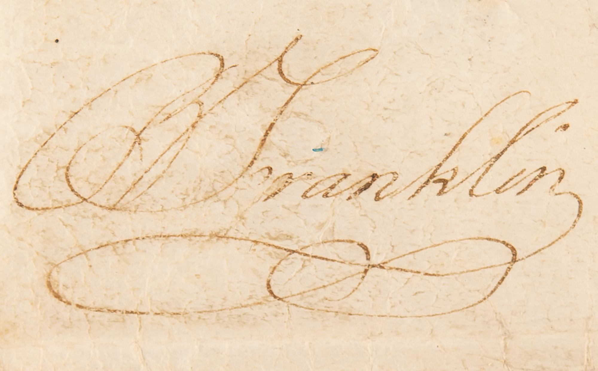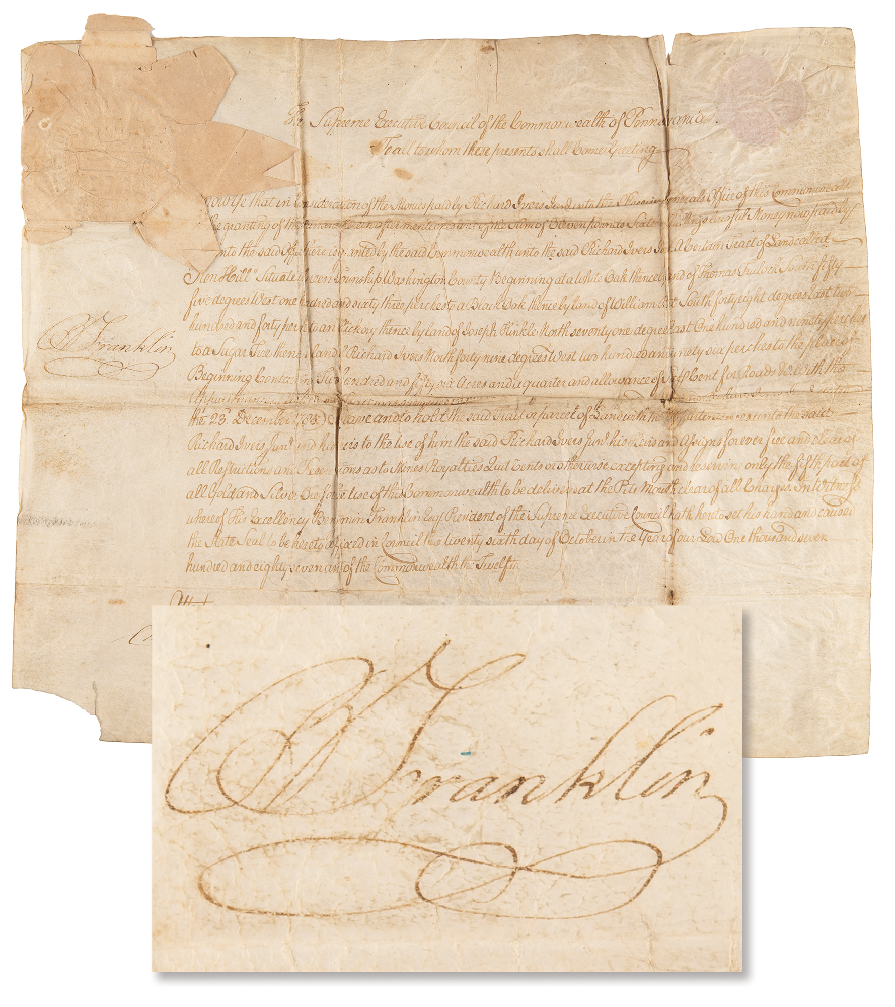 Manuscript vellum DS, signed “B. Franklin,” one page, 15.25 x 12.75, October 26, 1787. As president of Pennsylvania's Supreme Executive Council, Franklin issues a land grant to Richard Ivers for “a Certain Tract of Land called ‘Iron Hill’ Situate in Green Township Washington County…Containing Two hundred and fifty six Acres and a quarter.” Signed prominently on the left side by Benjamin Franklin, and countersigned below by Charles Biddle as secretary. The upper left retains the original paper state seal of Pennsylvania. In very good condition, with overall creasing, light soiling, loss to the lower left corner, and minor loss along the intersecting folds; Franklin's signature is clean and unaffected. Accompanied by an engraved portrait bearing a facsimile signature. Franklin issued this document as president of the Supreme Executive Council of Pennsylvania, a position analogous to the modern position of governor.