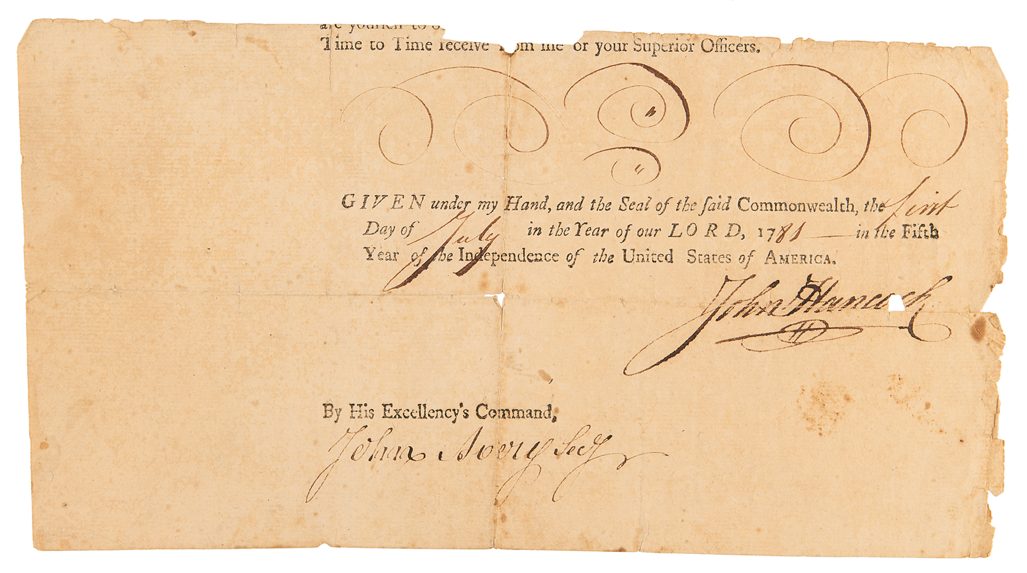 Revolutionary War-dated ink signature as governor of Massachusetts, "John Hancock,” on an off-white 11 x 5.75 sheet clipped from a partly-printed military document dated July 1, 1781, and countersigned by Secretary John Avery. In very good to fine condition, with a fold split, and a small area of paper loss, affecting Hancock's boldly signed last name. Accompanied by an engraved portrait with a facsimile signature.