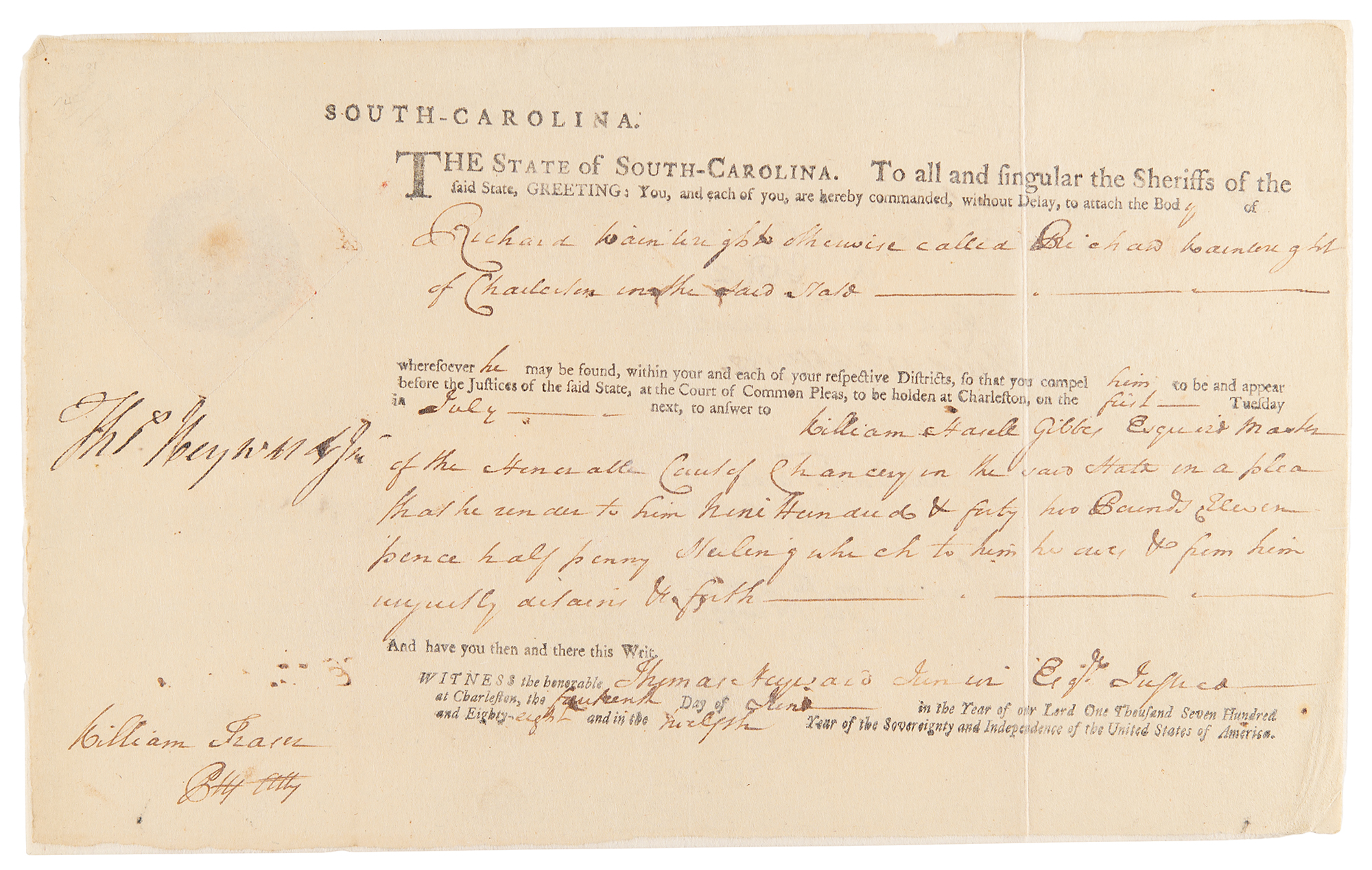 Signer of the Declaration of Independence from South Carolina (1746-1809) who was taken prisoner by the British during the siege of Charleston and held for about a year. Partly-printed DS, signed “Tho's Heyward Jun'r,” one page, 12.75 x 7.75, June 14, 1788. Order issued in South Carolina, ordering that Richard Wainwright be compelled to "be and appear before the Justices of the said State, at the Court of Common Pleas…to answer to William Hasell Gibbes…in a plea that he render to him Nine Hundred & fifty two Pounds & Eleven pence half penny Sterling which to him he owes." Boldly signed in the upper left by Heyward. The white paper seal affixed to the upper left remains intact. In fine condition, with complete archival silking to both sides. Accompanied by the original receipt from Walter R. Benjamin Autographs.