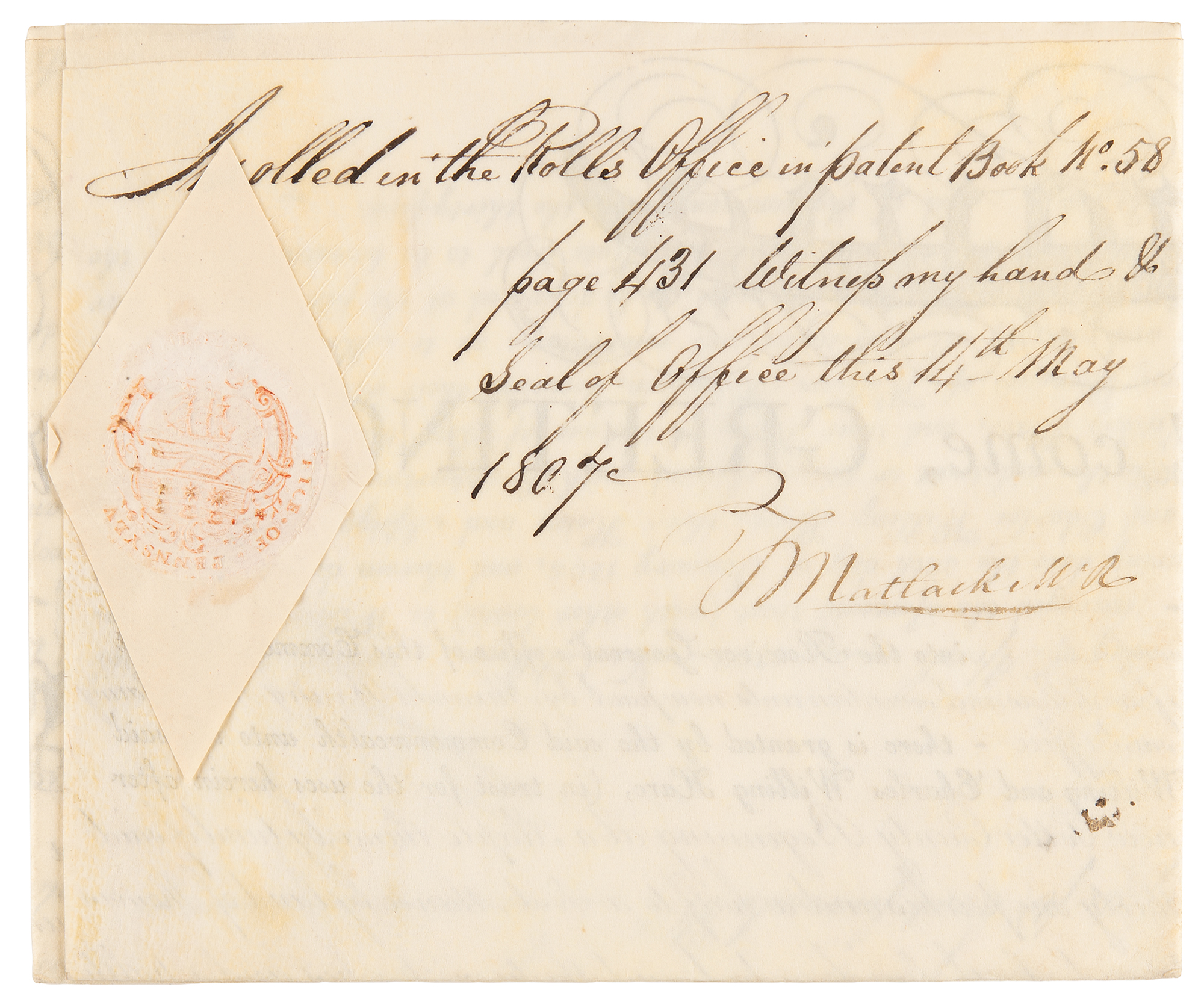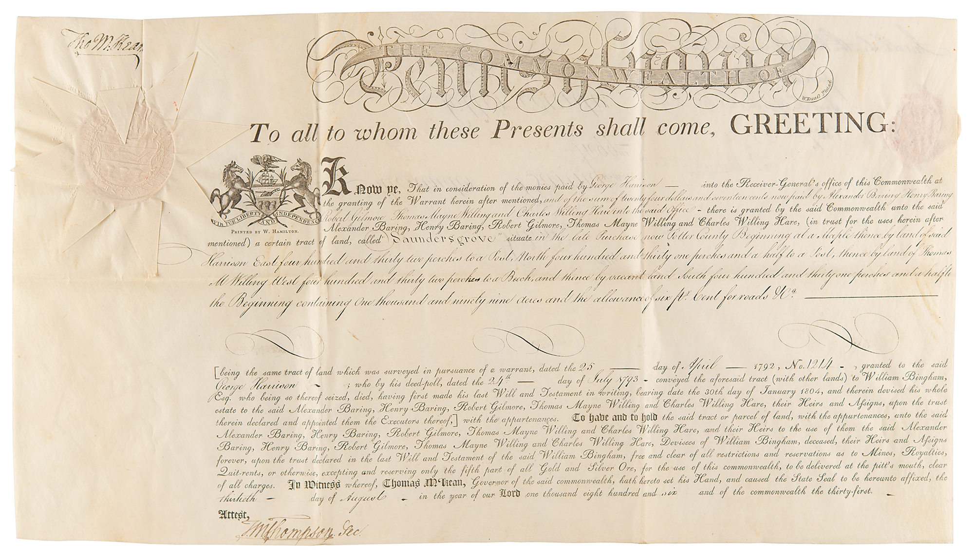 Signer of the Declaration of Independence from Delaware (1734-1817) who later served as president of the Continental Congress, Chief Justice of Pennsylvania, and Governor of Pennsylvania. Vellum manuscript DS, signed “Tho. M:Kean,” one page, 21 x 11.75, August 30, 1806. As governor of Pennsylvania, McKean grants to Alexander Baring and others "a certain tract of land, called 'Saunders grove,' situate in the late Purchase now Potter County." Boldly signed in the upper left corner by Governor Thomas McKean, and also endorsed on the reverse by Timothy Matlack, the engrosser of the Declaration of Independence. The crisp white paper seal affixed at the upper left remains intact. Interestingly, the deed reserves "only the fifth part of all Gold and Silver Ore, for the use of this Commonwealth." In fine condition.