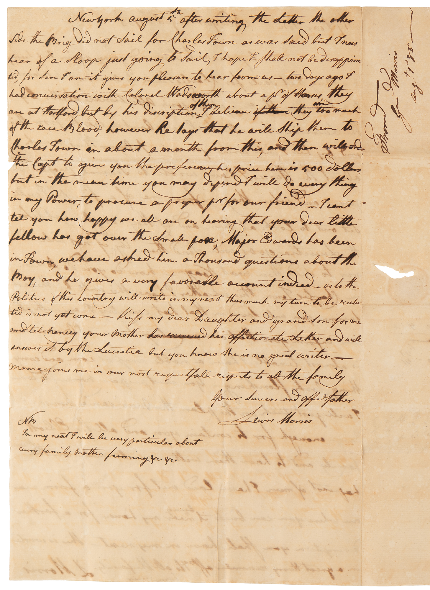 Landowner and developer from New York who signed the Declaration of Independence and served as a delegate to the Continental Congress (1726–1798). Unusual double ALS signed twice "L. Morris," one page both sides, 8 x 13, August 1 and 5, 1785. On both sides of a page, Lewis Morris writes two letters to his son, Lewis Morris, Jr., in South Carolina; the second letter was occasioned by an unexpected delay in the sailing of a ship bound for Charleston. On the front, Morris writes, in part: "I just come to Town and going again but hearing of a Brig that sails for Charles Town to-morrow I set down to acknowledge the receipt of your affectionate Letter…This much about the Horses I have wrote to several people in Jersey and when they inform me of a fine pr. I will set out to look at them…How do you do to live in Charles Town this weather I hope this will be the last Summer you will spend in that hot country. I can with pleasure inform you that our house at Morrisania is almost tenable I have a noble crop of corn and every thing looks flourishing. You must prepare Nancey to come. I will just touch on the plan the Morrisania house is large enough for to contain you and all the Elliott family and to have them with us will make me the happiest of men. I have laid out for you a farm near me where you can build it being near my house."