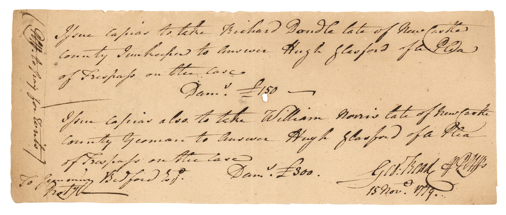 Signer of the Declaration of Independence from Delaware (1733-1798). ADS, signed “Geo: Reed,” one page, 8 x 3, November 15, 1779. Handwritten legal document calling for "Richard Doudle late of New Castle County Innkepper to answer Hugh Glasford of a Plea of Trespass on the case, Dam's £150…also to take William Norris late of New Castle County Yeoman to answer Hugh Glasford of a Plea of Trespass on the case, Dam's £300." Neatly signed at the conclusion in ink by Reed. In fine condition, with a trivial small hole to the center.