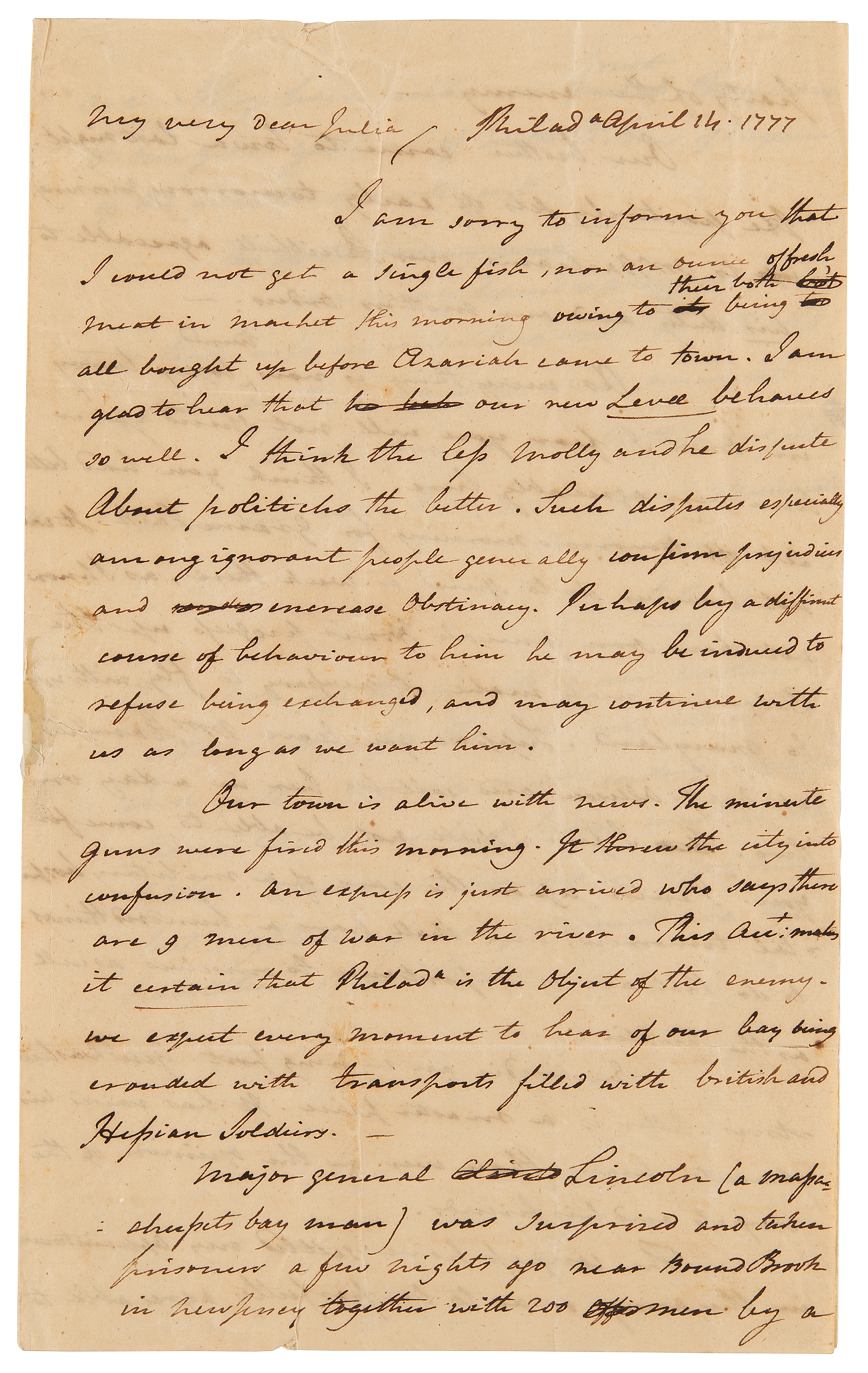 Revolutionary War-dated ALS signed “B. Rush,” three pages on two adjoining sheets, 7.25 x 12, April 14, 1777. Addressed from Philadelphia, a handwritten letter to his wife, Julia, in part: “I am sorry to inform you that I could not get a single fish, nor an ounce of fresh meat in market this morning owing to their both being all bought up before Azariah came to town. I am glad to hear that our new Levee behaves so well. I think the less Molly and he dispute about politicks the better. Such disputes especially among ignorant people generally confirm predjudices and increase Obstinacy. Perhaps by a different course of behavior to him he may be induced to refuse to be exchanged, and may continue with us as long as we want him.