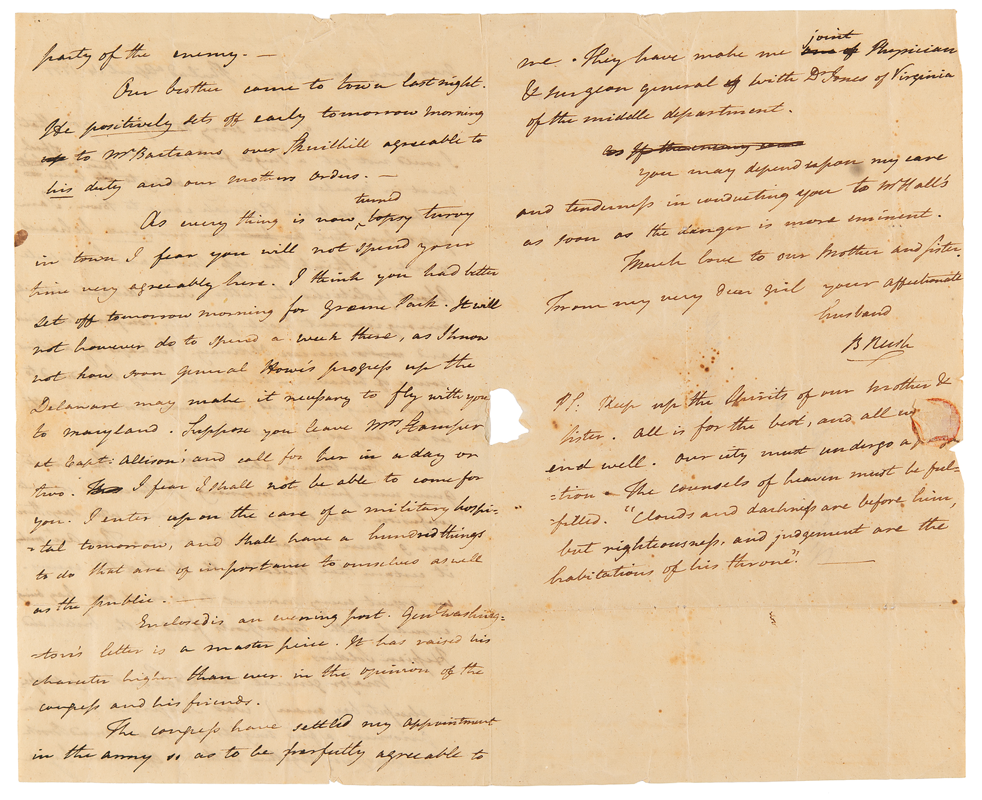 You may depend upon my care and tenderness in conducting you to Mr. Halls as soon as the danger is more imminent. Much love to our brother and sister.” Rush adds a postscript: “Keep up the spirits of our brother and sister. All is for the best and all will end well…The counsels of Heaven must be fulfilled. ‘Clouds and darkness are before him, but righteousness and judgment are the habitation of his throne.’” In very good to fine condition, with seal-related paper loss near the hinge.