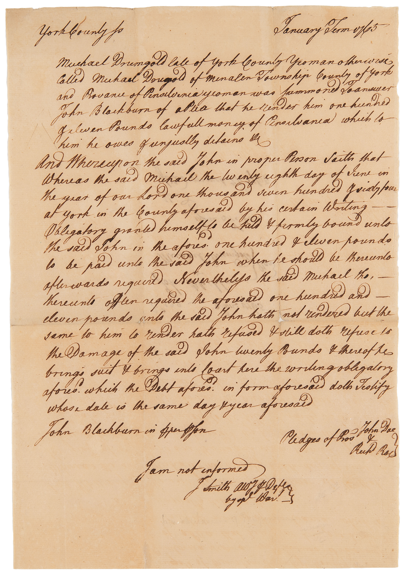 Signer of the Declaration of Independence from Pennsylvania (1719–1806). Autograph document signed “J. Smith, Atty & Def’t, by spl. War,” one page, 7.75 x 11.25, January 1765. A handwritten legal document from York County regarding a case between Michael Drumgold and John Blackburn, in part: “Michael Drumgold late of York County Yeoman…was summoned to answer John Blackburn of a Plea that he render him one hundred & eleven Pounds lawful money of Pennsylvania which to him he owes & unjustly detains.” Signed at the conclusion by James Smith. In fine condition, with old archival repairs to the back of the folds.