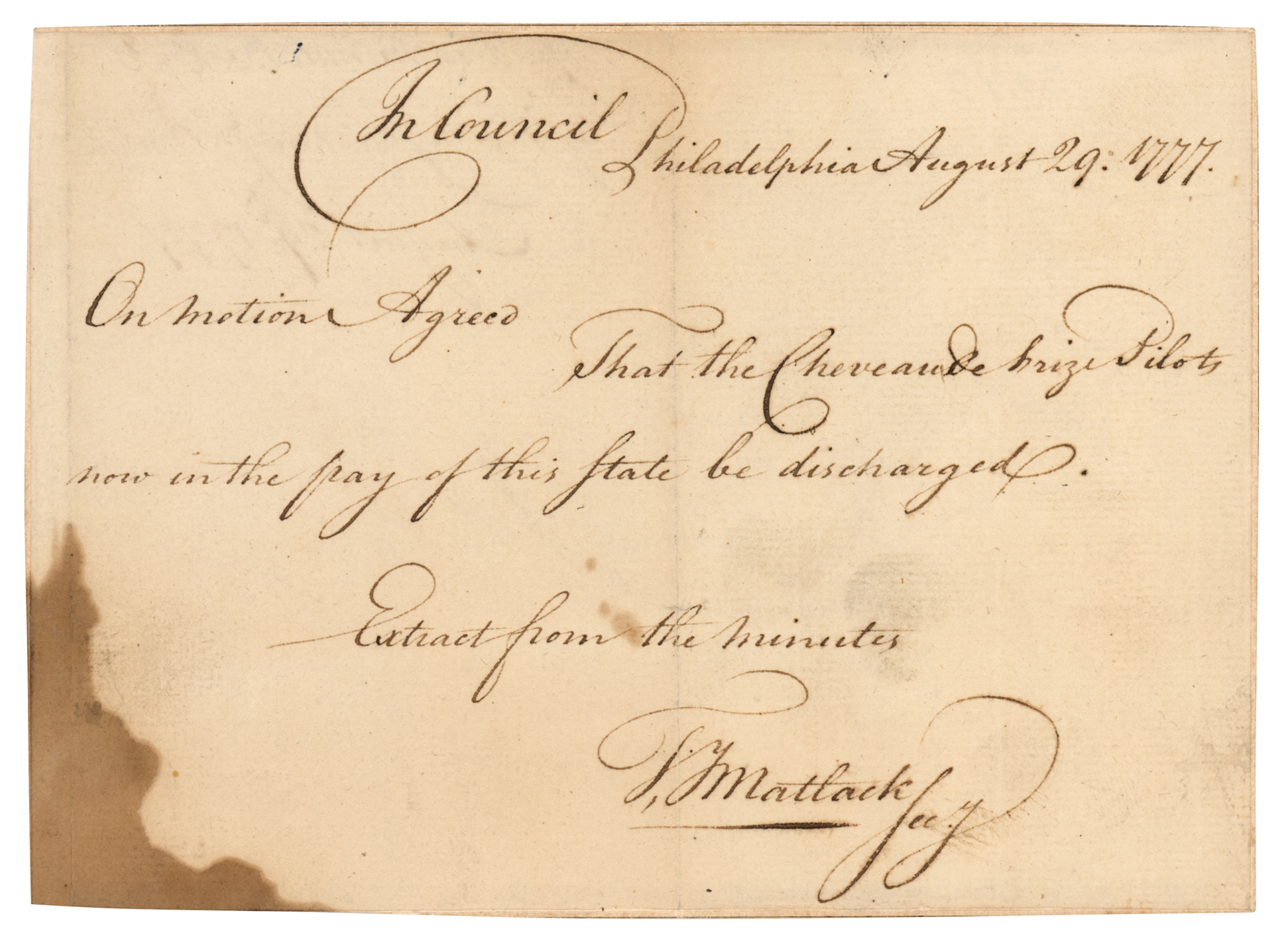 Political leader from Pennsylvania best known for engrossing the Declaration of Independence on parchment (1736–1829). Revolutionary War-dated ADS signed “T. Matlack, Sec’y,” one page, 6.25 x 4.5, August 29, 1777. Handwritten “Extract from the minutes” of the Supreme Executive Council in Philadelphia, in full: “On motion, Agreed, That the Cheaveau de frize Pilots now in the pay of the state be discharged.” Signed below by Timothy Matlack as secretary. In fine condition, with a stain to the lower left corner.
