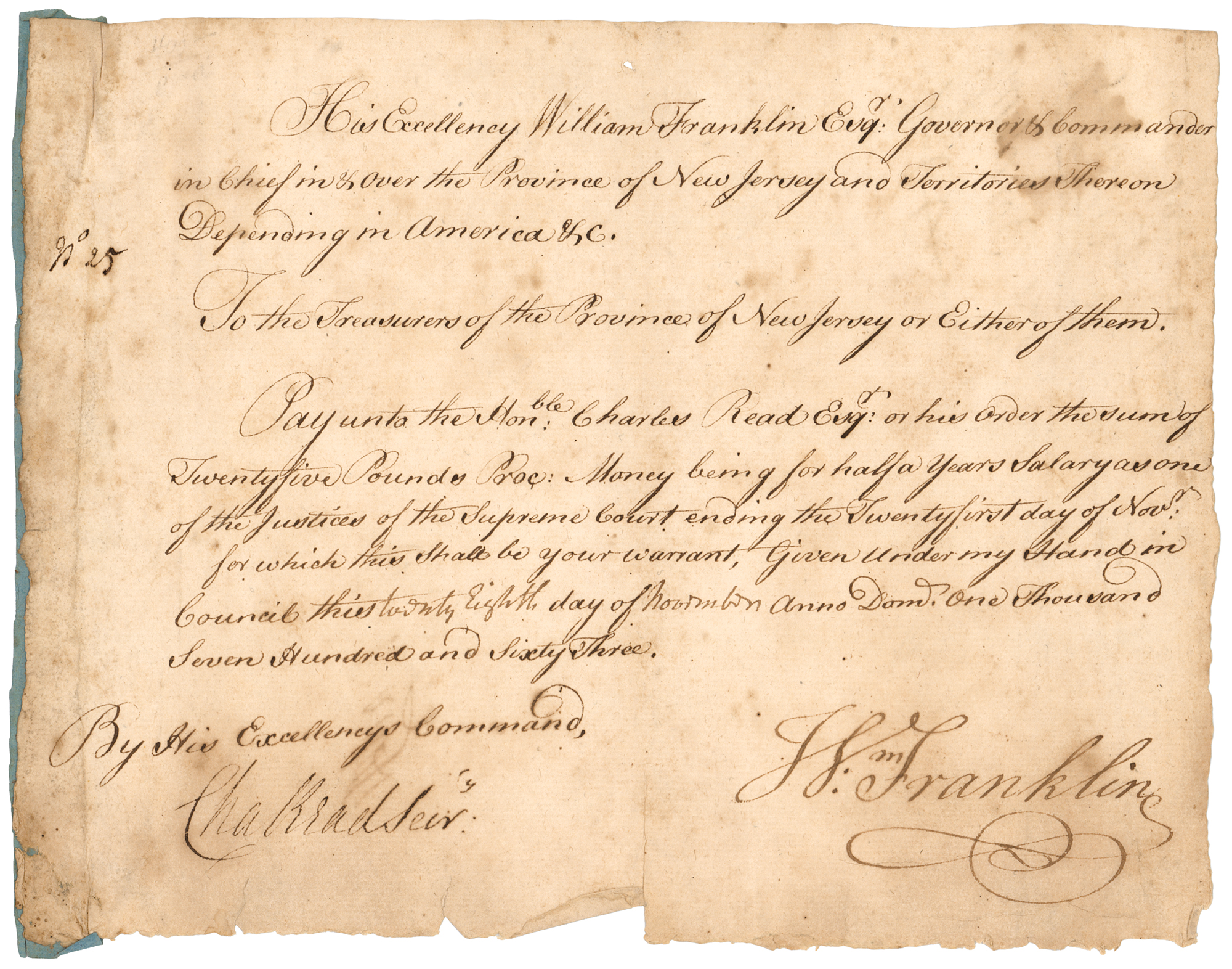 Illegitimate son of Benjamin Franklin (1730–1813) who served as the last colonial governor of New Jersey; unlike his father, he remained a steadfast Loyalist throughout the Revolutionary War. Manuscript DS, signed “Wm. Franklin,” one page, 8.25 x 6.5, November 28, 1763. As governor of New Jersey, Franklin orders payment to "the Hon'ble Charles Read Esq'r or his order the sum of Twenty five Pounds…being for half a year's salary as one of the Justices of the Supreme Court." Nicely signed at the conclusion by Governor William Franklin, and further endorsed by Charles Read. In very good to fine condition, with light staining and soiling, and an old mounting strip along the left edge.
