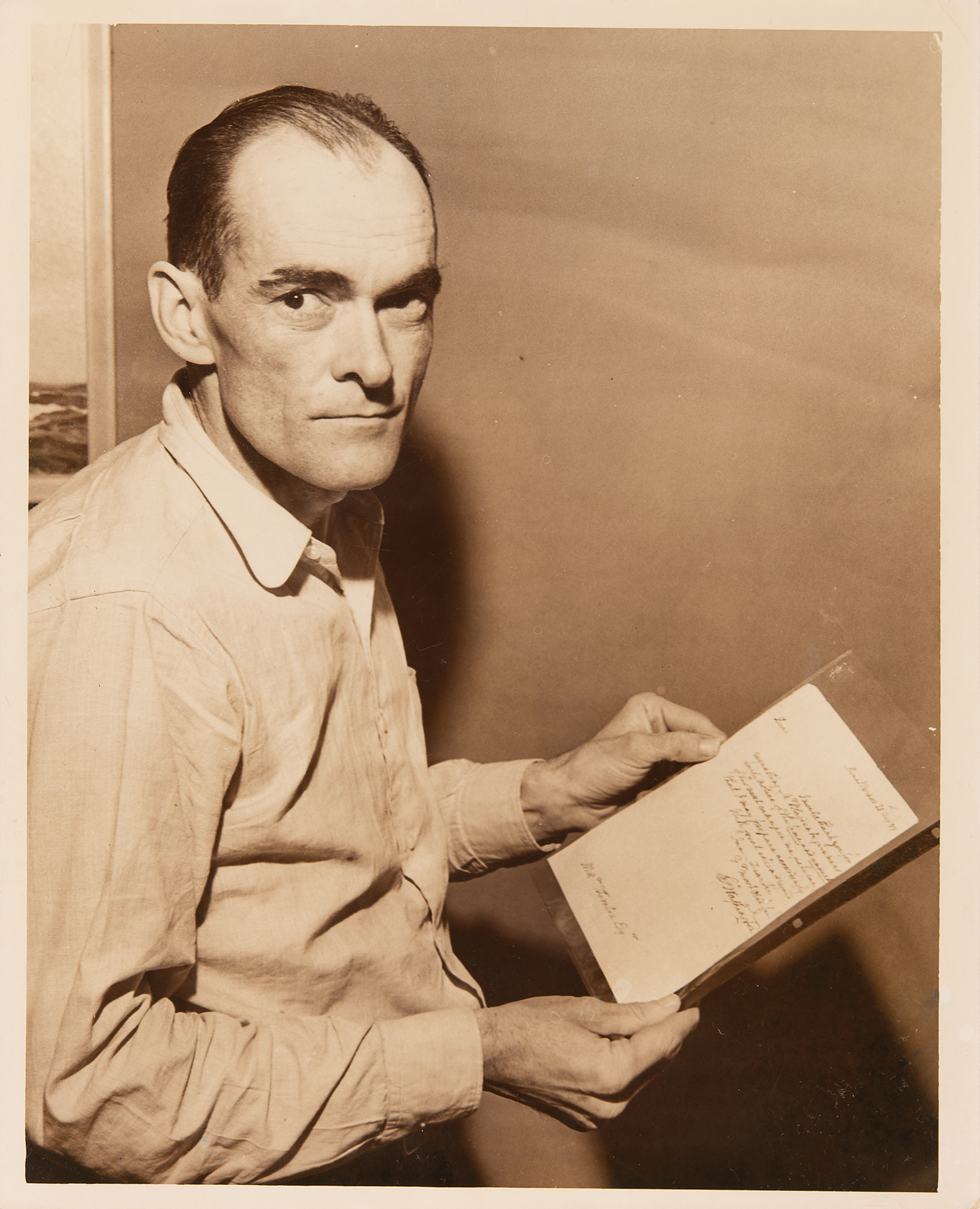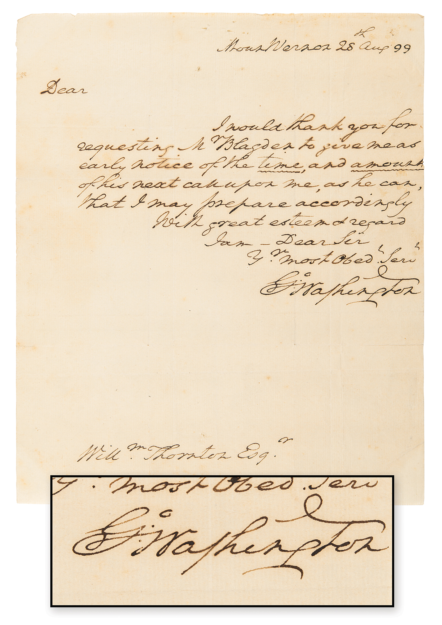 ALS signed “Go: Washington,” one page, 7.25 x 9, August 28, 1799. Handwritten letter to William Thornton, the architect who designed the United States Capitol. In full: "I would thank you for requesting Mr. Blagden to give me as early notice of the time, and amount, of his next call upon me, as he can, that I may prepare accordingly." In fine condition, with some faint staining, and a few short fold splits. Accompanied by a vintage press photo of one-time owner Joseph Plummer, a collector of books and Americana, holding the letter.