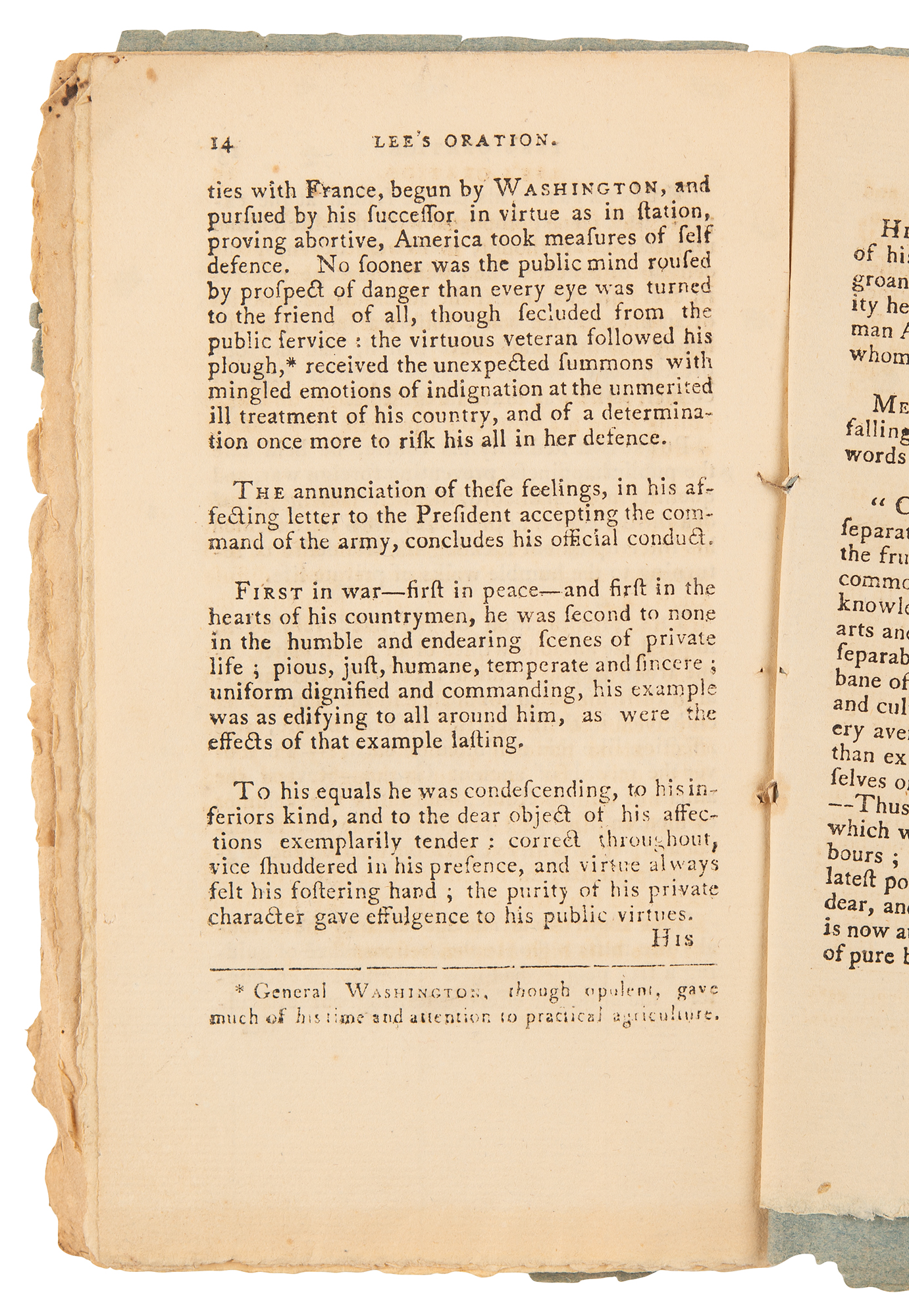 Rare booklet entitled "A Funeral Oration on the Death of Gen. Washington, delivered, at the request of Congress, by Major General Henry Lee," bound in plain paper wrappers, 15 pages, 4.25 x 7, printed in Dover by Samuel Bragg, June 1800. Lee's memorial address, in small part: "First in war—first in peace—and first in the hearts of his countrymen, he was second to none in the humble and endearing scenes of private life; pious, just, humane, temperate, and sincere; uniform, dignified, and commanding, his example was as edifying to all around him as were the effects of that example lasting. To his equals he was condescending; to his inferiors kind; and to the dear object of his affections exemplarily tender; correct throughout, vice shuddered in his presence, and virtue always felt his fostering hand; the purity of his private character gave effulgence to his public virtues. His last scene comported with the whole tenor of his life.—Although in extreme pain, not a sigh, not a groan escaped him; and with undisturbed serenity he closed his well spent life. Such was the man America has lost—Such was the man for whom our nation mourns." In very good condition, wear and creasing to wrappers and corners.