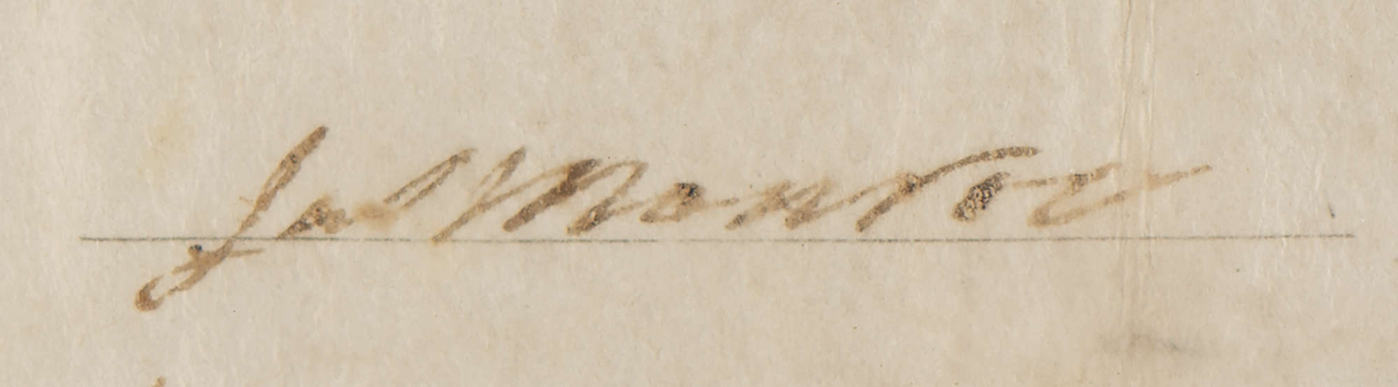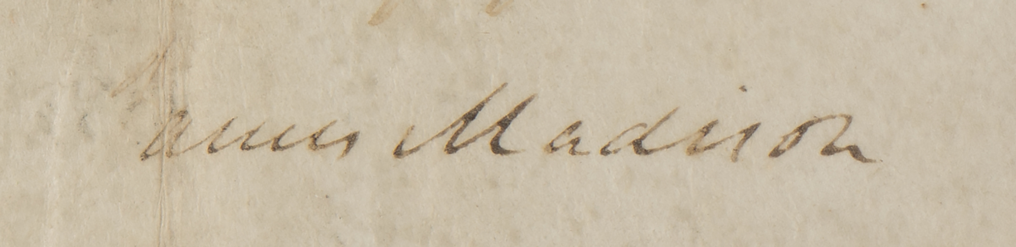 Partly-printed vellum DS, signed “James Madison" as president and "Jas. Monroe" as secretary of state, one page, 10 x 9.5, July 3, 1815. Lower section of a ship's pass issued to the "Brig Gleaner…To Pass with her Company Passengers Goods and Merchandize without any hinderance seisure or molestation." Signed at the conclusion by President James Madison and Secretary of State James Monroe. The paper seal affixed to the lower left remains intact. Framed to an overall size of 12.5 x 12. In very good to fine condition, with the upper portion of the document trimmed off, and the handwritten portions of text faded but legible; Madison and Monroe signatures are bold, although the "J" in Madison's first name is extremely faint.