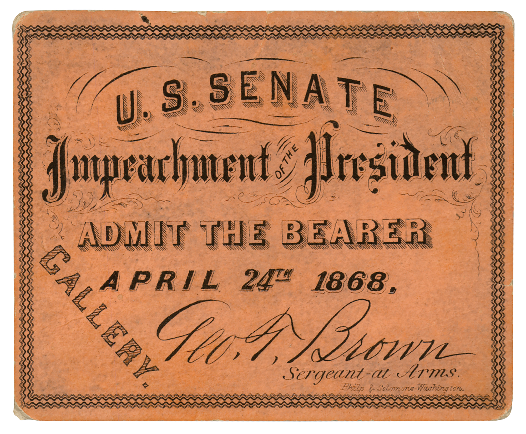 Original 3.5 x 3 orange gallery ticket stub to the U.S. Senate Impeachment of President Andrew Johnson on April 24, 1868. This ticket dates to the closing arguments, which began on April 22nd and concluded on May 6th. In fine condition.