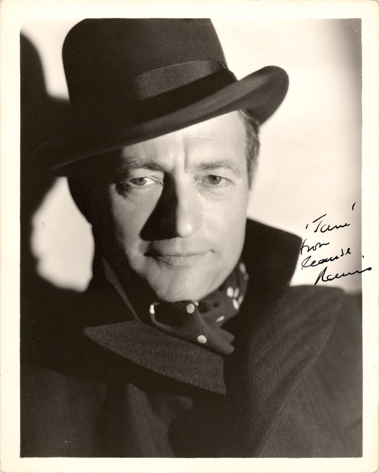 Vintage matte-finish 8 x 10 close-up photo of Rains in a bowler hat, signed and inscribed in fountain pen, "'Jane,' from, Claude Rains.” In very fine condition.