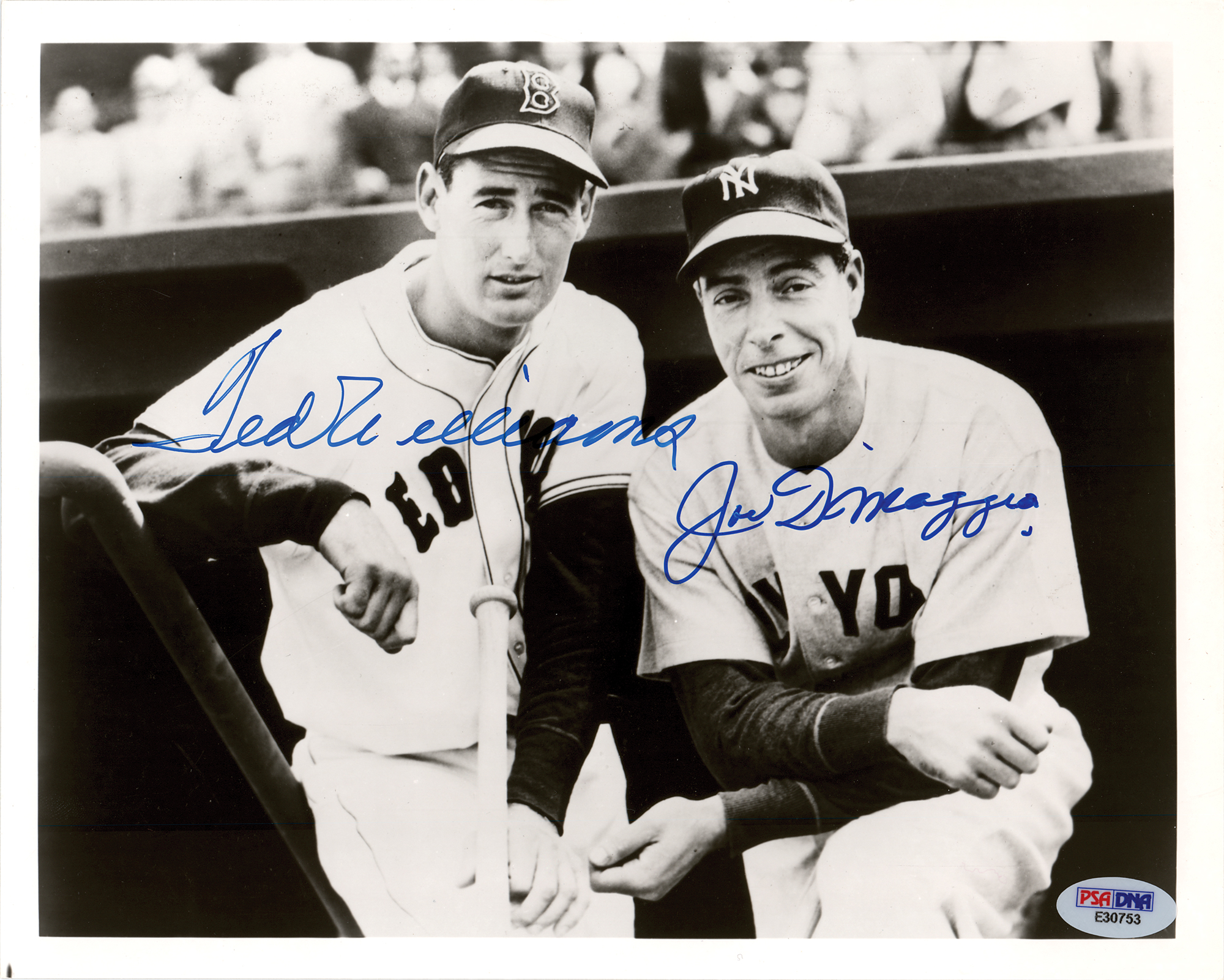Glossy 10 x 8 photo of Ted Williams and Joe DiMaggio in their Red Sox and New York Yankees uniforms, signed by both in blue felt tip. In fine condition, with a PSA/DNA authentication label affixed to the lower right corner. Accompanied by a full letter of authenticity from PSA/DNA.