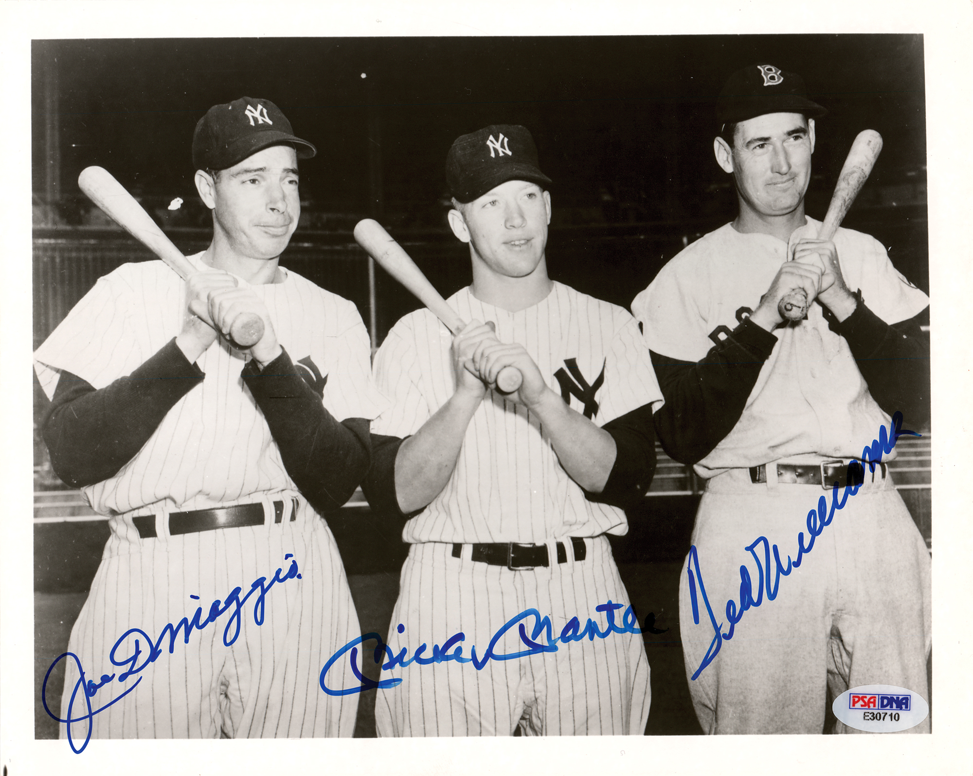 Glossy 10 x 8 photo of Joe DiMaggio, Mickey Mantle, and Ted Williams lined up with bats ready, signed by all three in blue felt tip. In fine condition, with a PSA/DNA authentication label affixed to the lower right corner. Accompanied by a full letter of authenticity from PSA/DNA.