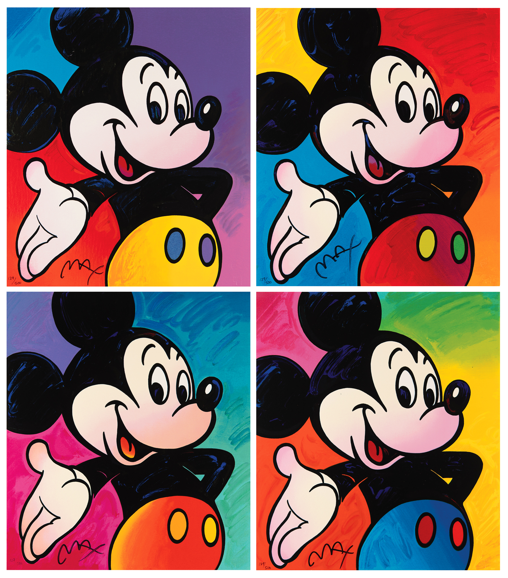 Limited edition suite of four color 14 x 16 serigraphs of Mickey Mouse by pop artist Peter Max, entitled ‘Mickey Suite,’ each numbered 129/500 and signed in the lower left in felt tip, “Max.” While each serigraph bears a nearly identical line drawing of the Disney icon, shown in a joyous half-length pose with one hand on his hip and the other extended over Max’s signature, the pieces proffer four unique and vibrant color combinations. The lower right corner of each serigraph bears Peter Max and SOMA blindstamps. In overall very fine condition. Accompanied by a print certification from AMX Art Ltd.