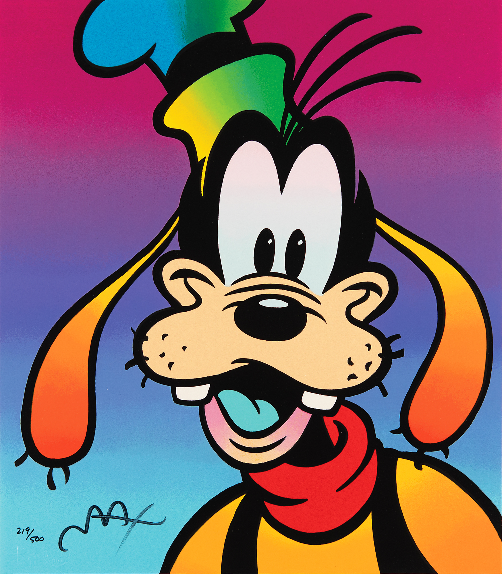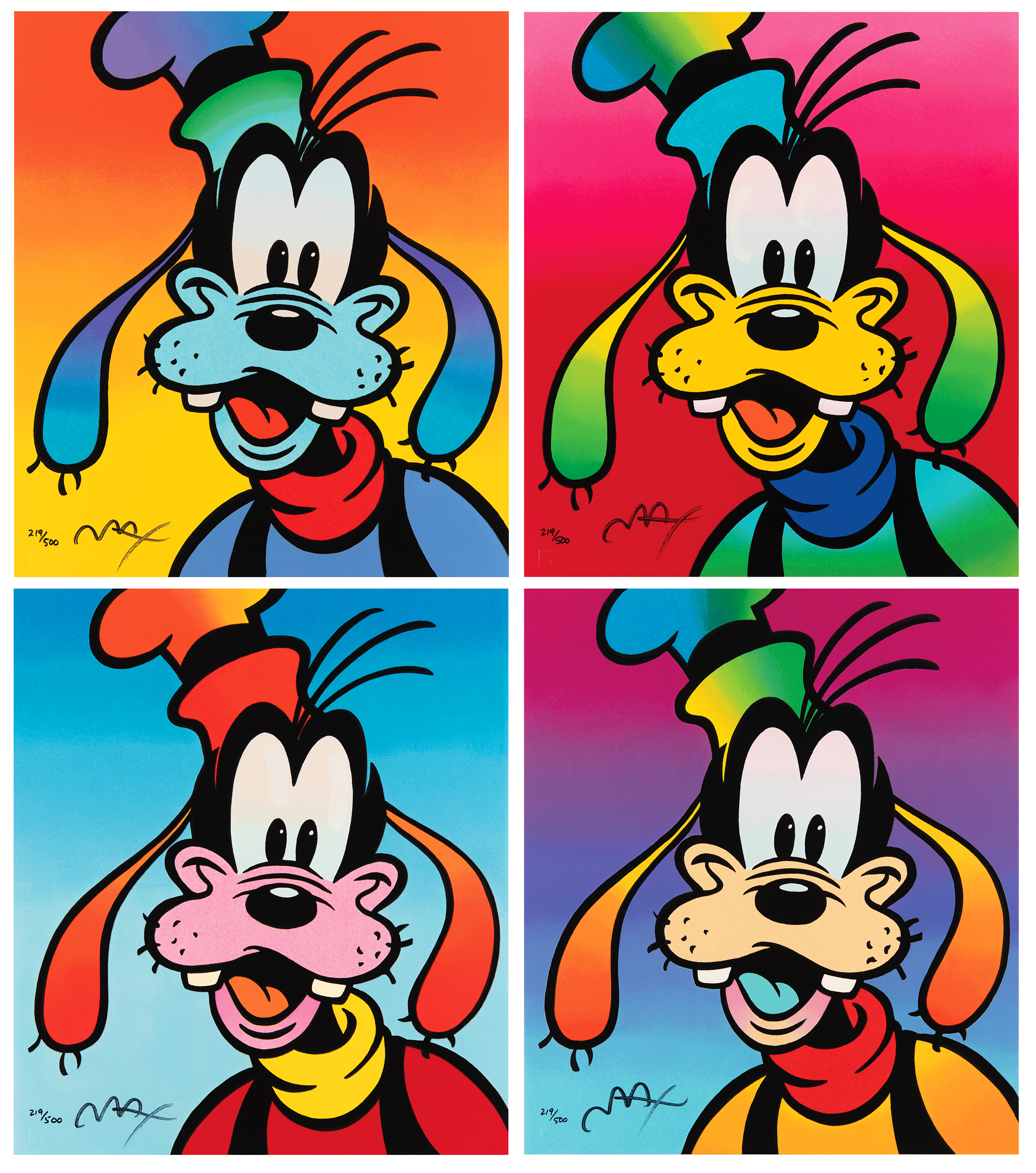 Limited edition suite of four color 14 x 16 serigraphs of Goofy by pop artist Peter Max, entitled ‘The Goofy Suite,’ each numbered 219/500 and signed in the lower left in felt tip, “Max.” While each serigraph bears a nearly identical line drawing of the Disney icon in a friendly up-close pose, the pieces proffer four unique and vibrant color combinations. The lower left corner of each serigraph bears “Peter Max 1994” and SOMA blindstamps. In overall very fine condition. Max, along with Disney chairman Michael Eisner, opened the first Disney Art Gallery, where Max premiered his limited editions of fabulous Disney icons such as Donald Duck, Goofy, and Snow White.