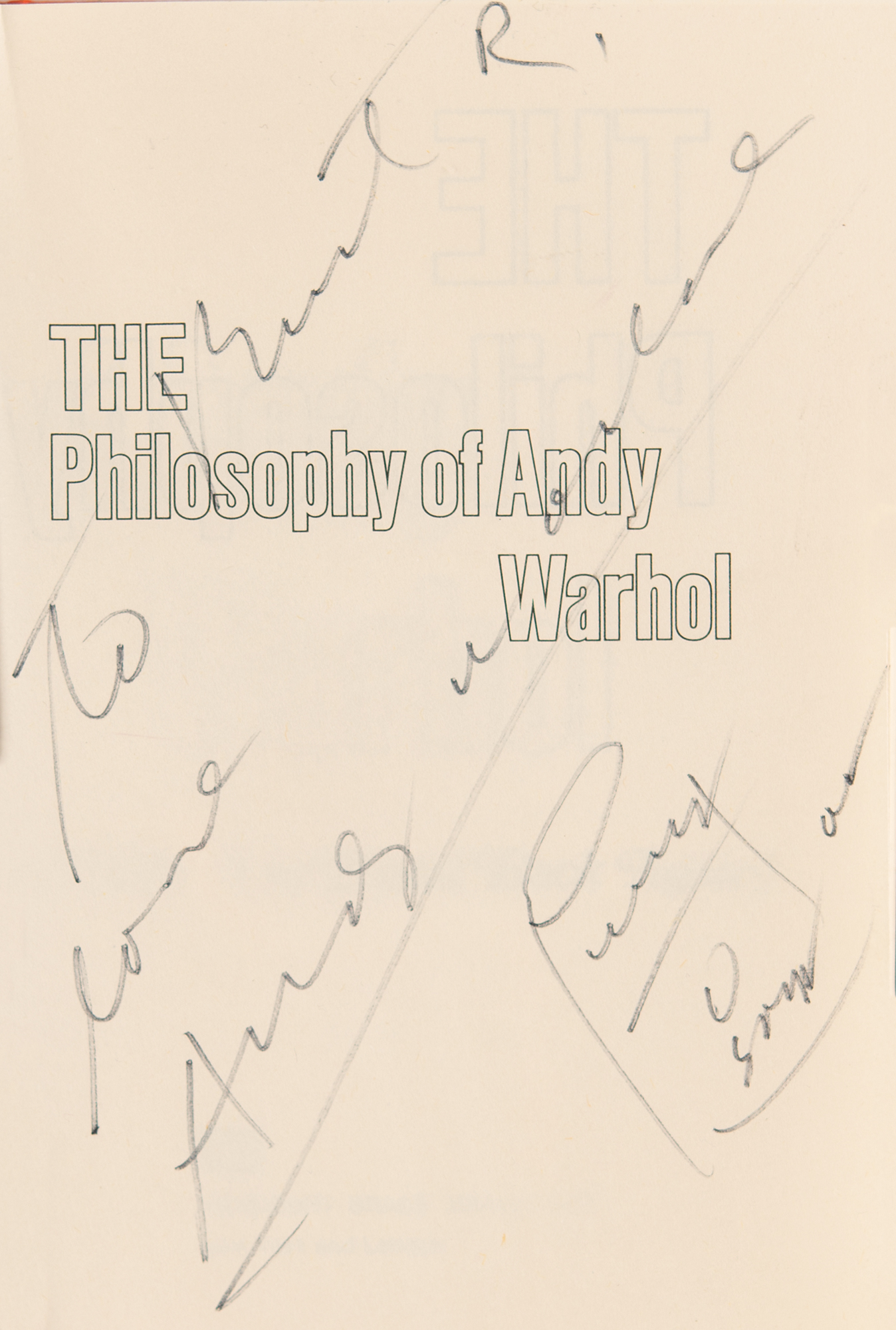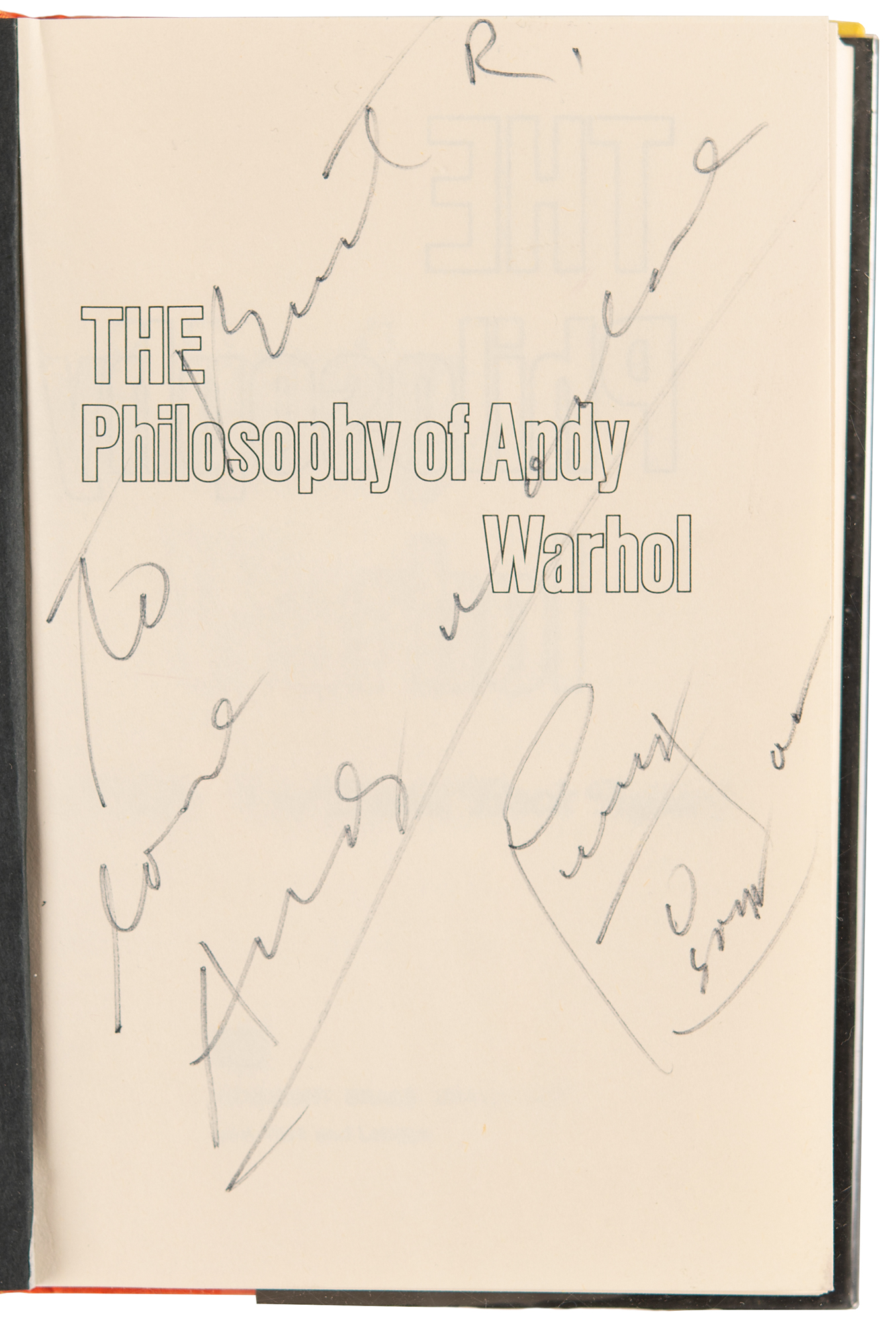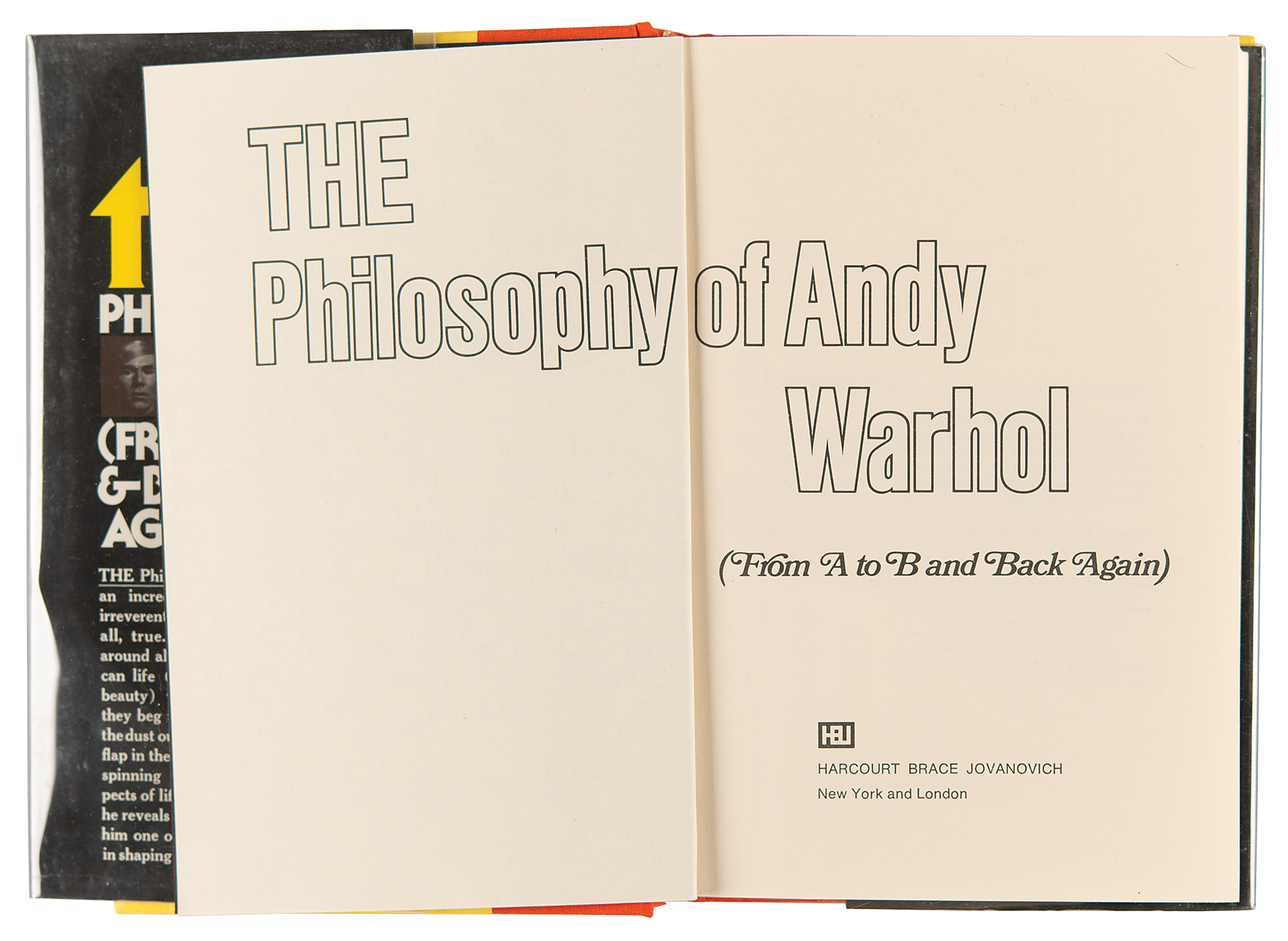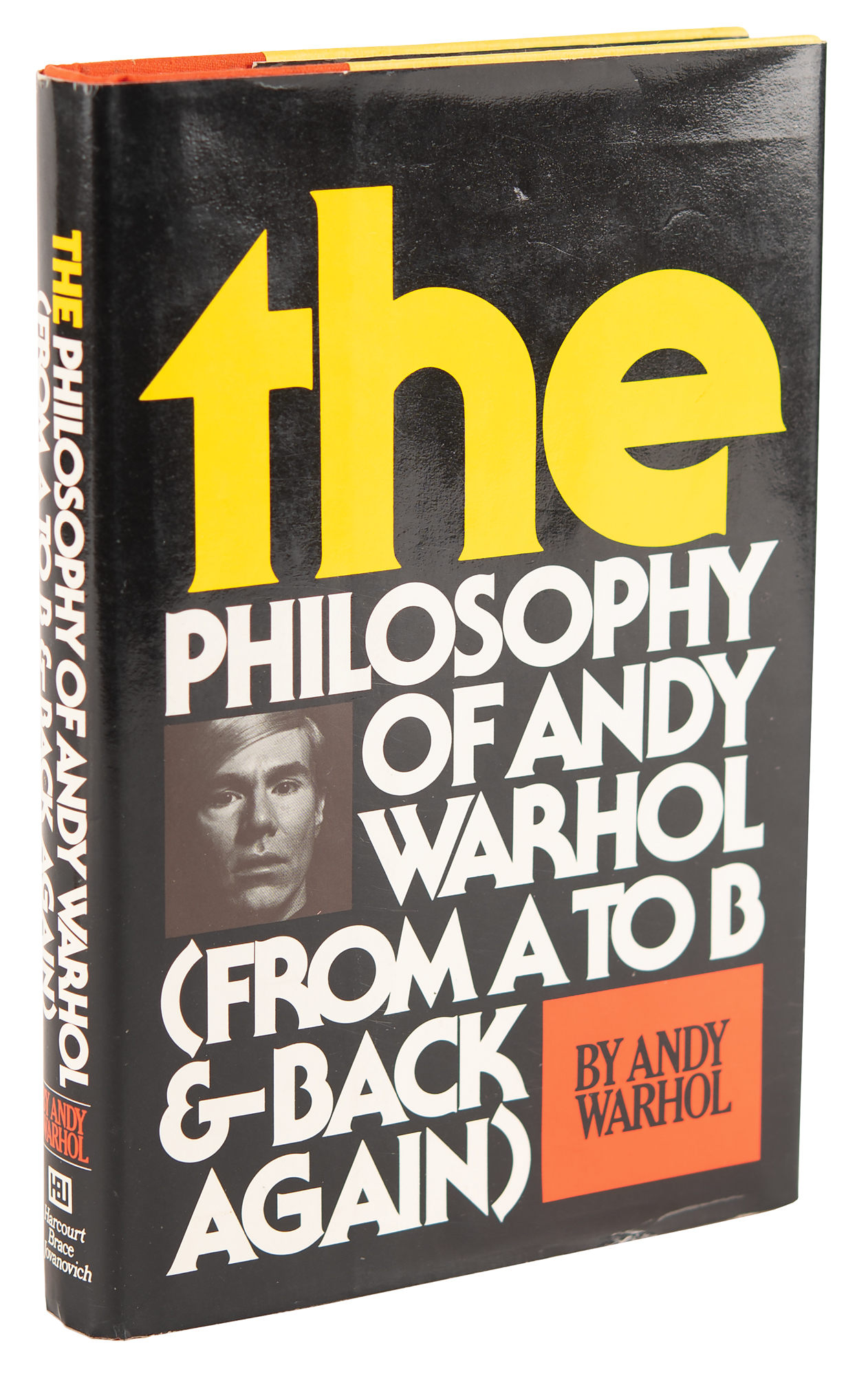 Signed book: The Philosophy of Andy Warhol (From A to B & Back Again). NY: Harcourt Brace Jovanovich, 1975. Hardcover with dust jacket, 5.75 x 8.5, 241 pages. Signed and inscribed on the half-title page in black felt tip, "To Burt R., love, Andy Warhol," who adds a sketch of his classic Campbell's “Soup" can below and signs again with his signature, “AW.” In very fine condition. The consignor purports that the book derives from the collection of Dinah Shore and that it was inscribed to Burt Reynolds, to whom she was married from 1971 to 1976.