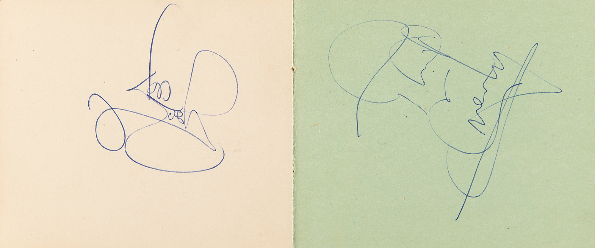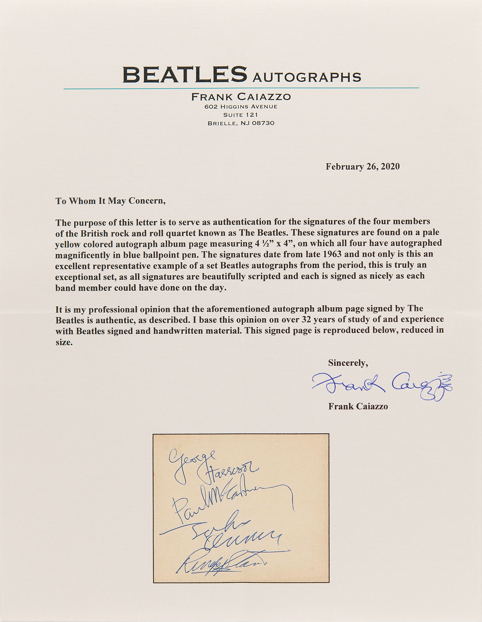 Superlative vintage circa late 1963 ballpoint signatures, "George Harrison," "Paul McCartney," "John Lennon," and "Ringo Starr,” on an off-white 4.5 x 4 album page held within a hardcover autograph album. Other signers include the Everly Brothers, Billy J. Kramer, Billy Fury, John Leyton, Eden Kane, the Temperance Seven, the Chris Barber Jazz Band, and a few others. The autograph album itself has separated at the spine, but the Beatles-signed page is in pristine, very fine condition. Accompanied by a letter of authenticity from noted Beatles expert Frank Caiazzo, in part: "The signatures date from late 1963 and not only is this an excellent representative example of a set of Beatles autographs from the period, this is truly an exceptional set, as all signatures are beautifully scripted and each is signed as nicely as each band member could have done on the day."