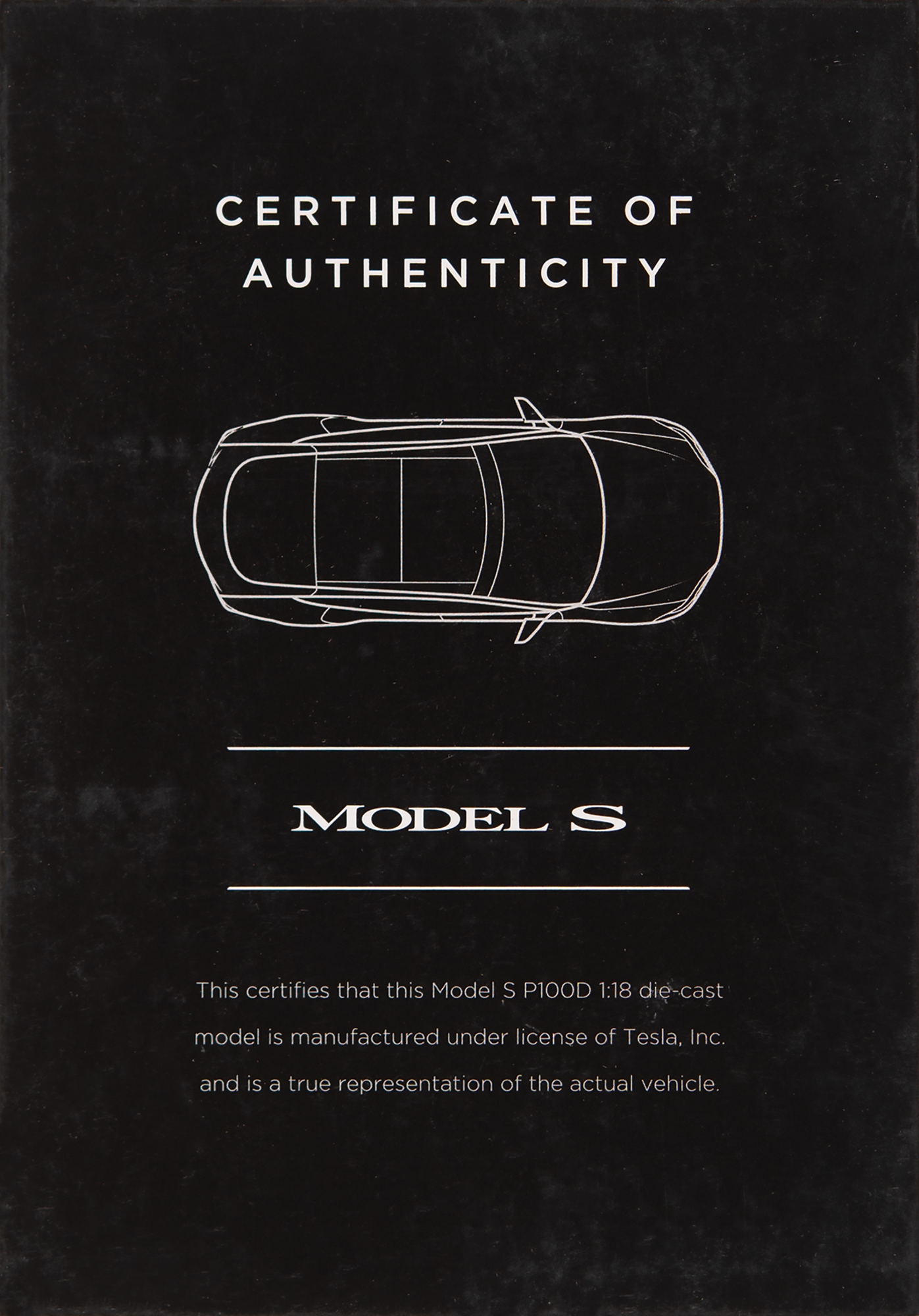 Spectacular 1:18 die-cast scale model of the Tesla Model S P100D, nicely signed on the hood in silver ink by Elon Musk. In very fine condition. Accompanied by a full letter of authenticity from PSA/DNA, as well as the model's original box (which exhibits some wear). The Model S P100D with Ludicrous mode was the quickest production car in the world at the time of its 2016 introduction, with a 0-60 mph time of 2.5 seconds.